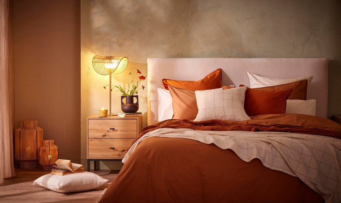 Layering is key for this trend - mix green linens with cosy throws and plush cushions. Pair your bedding with wooden furniture, woven accents, and burnt orange accessories for your autumn bedroom décor. The trend is designed to bring a hint of the outdoors indoors, to allow you to feel connected to nature and to recharge in a peaceful atmosphere.