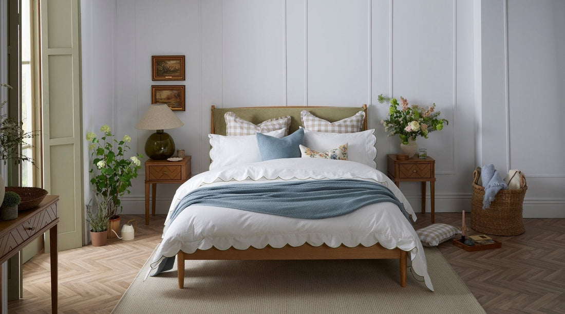 Start with the details. You don’t need to overhaul your home, just layer in the right accents. Scalloped edges, curved furniture legs, and classic floral prints can instantly elevate your space. Choose timeless, neutral pieces that will last, and build the look over time with affordable soft furnishings like gingham bedding, textured cushions, and natural throws.