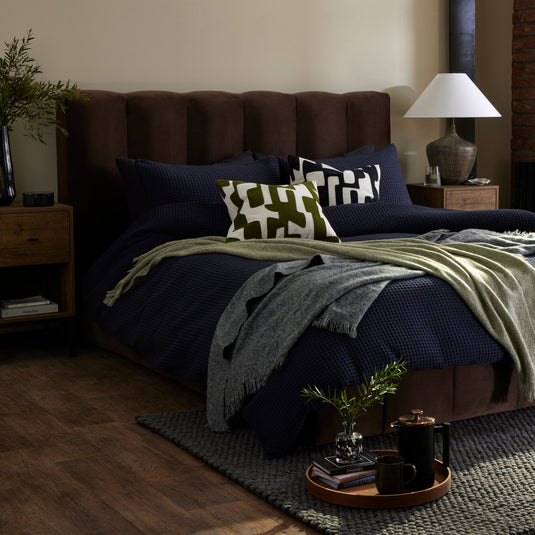 A bestseller, now in navy. The Portofino Navy combines textured cotton waffle with a soft 100% cotton reverse. Easy-care fabric means minimal to no ironing is required - because who has time for that? Layer it up with our super soft, cosy, and effortlessly stylish Marled Tassel Throw. Great value and versatile, it's ideal for draping over both beds and sofas.