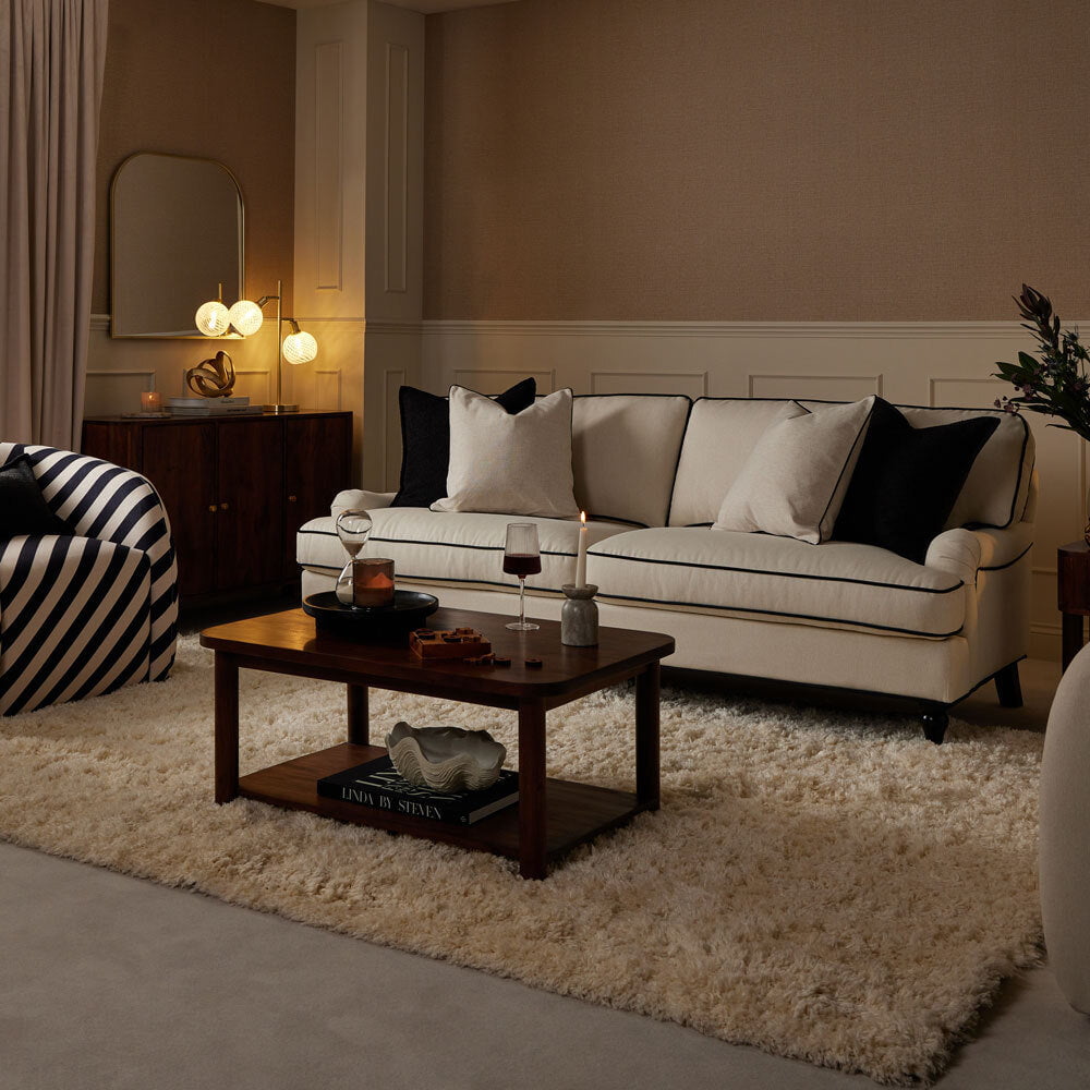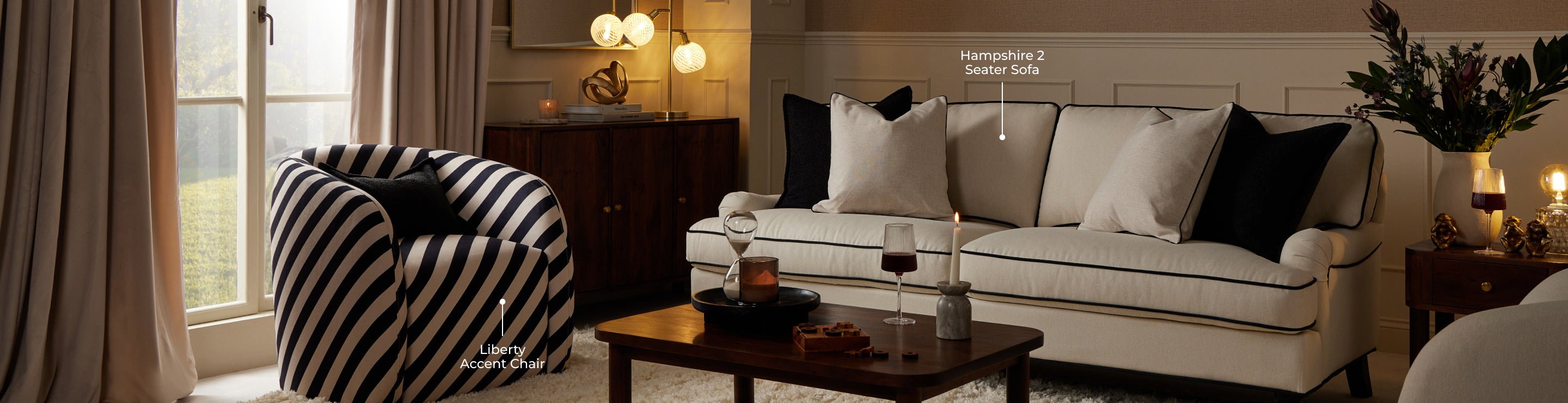 This living room is all about contrast. With its soft cream upholstery and piped black edging, the Hampshire sofa feels classic yet contemporary. Paired with the bold striped Liberty Accent Chair, this duo brings depth, drama, and a designer’s touch to your everyday lounging.