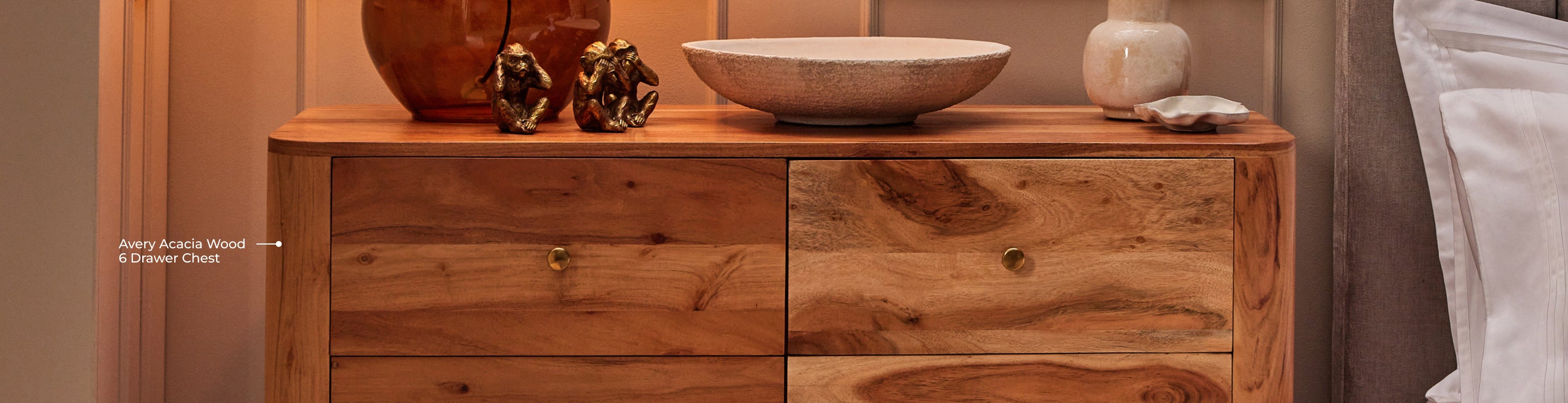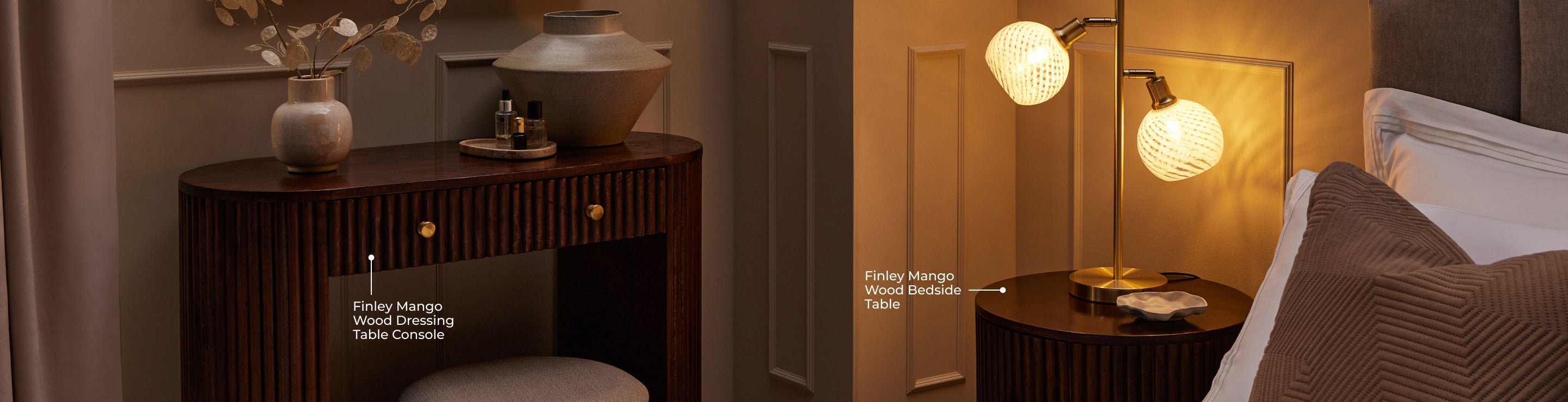 At the heart of the range are Finley and Avery, two Indian solid wood collections crafted for lasting style. Finley, in rich mango wood, features soft fluting and a timeless feel, while Avery, made from acacia, brings gentle curves and elegant proportions. Both ranges include versatile bedroom furniture that adds a touch of sculptural charm wherever it’s placed.