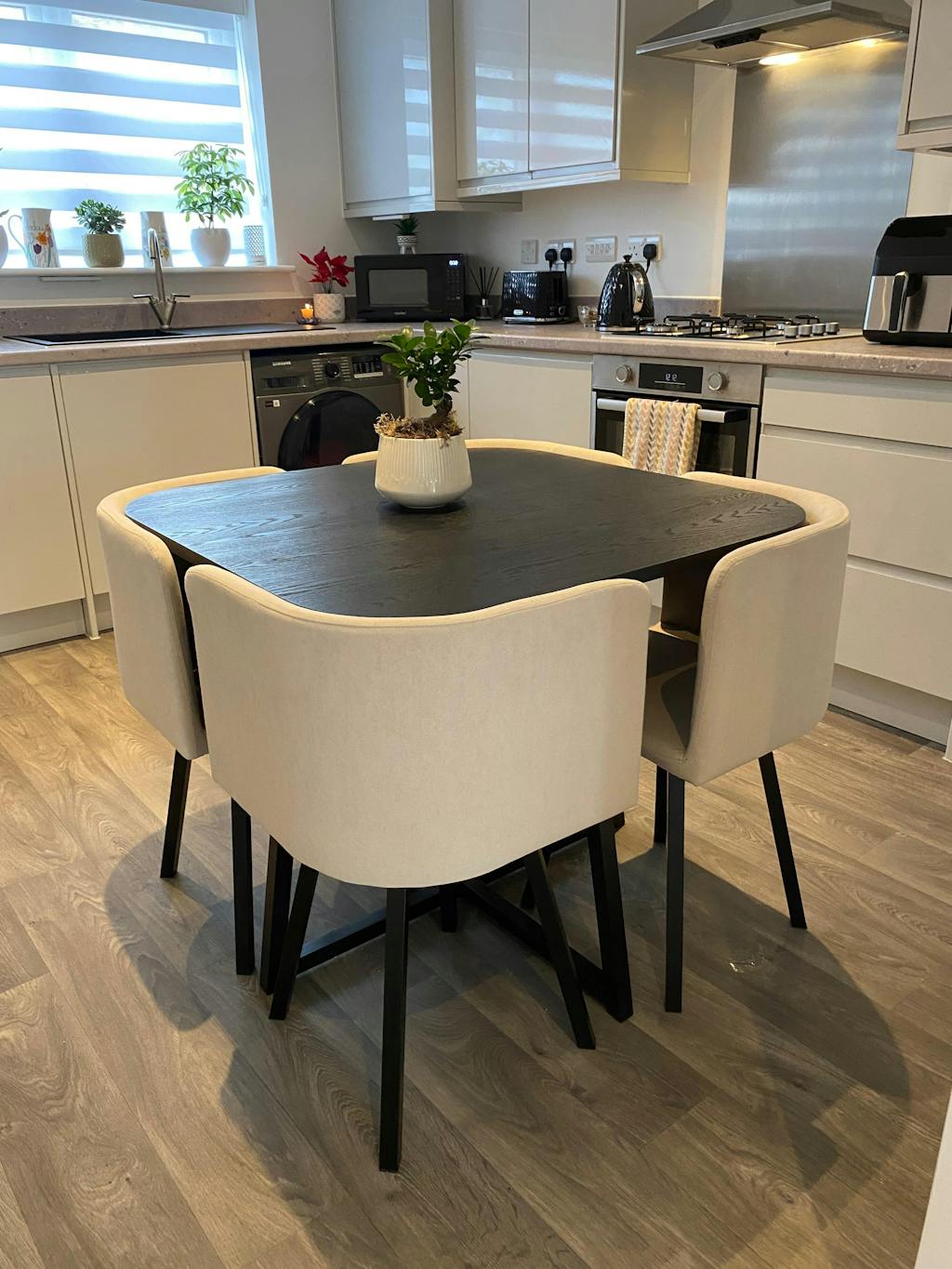 When not in use, the chairs nest neatly under the table - seamless style for everyday living.