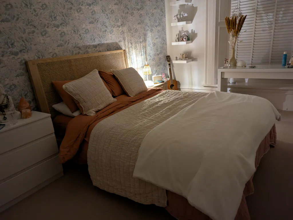 To complete your oasis, consider pairing your Bali wooden bed frame with warm, earthy tones, like burnt orange, for a cosy bedroom feel. Create an inviting sleeping space with your choice of mattress and bedding.