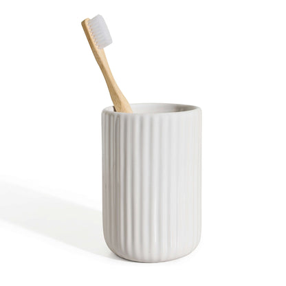 Upgrade your bathroom basics with this sleek, high-gloss duo in ribbed stoneware.