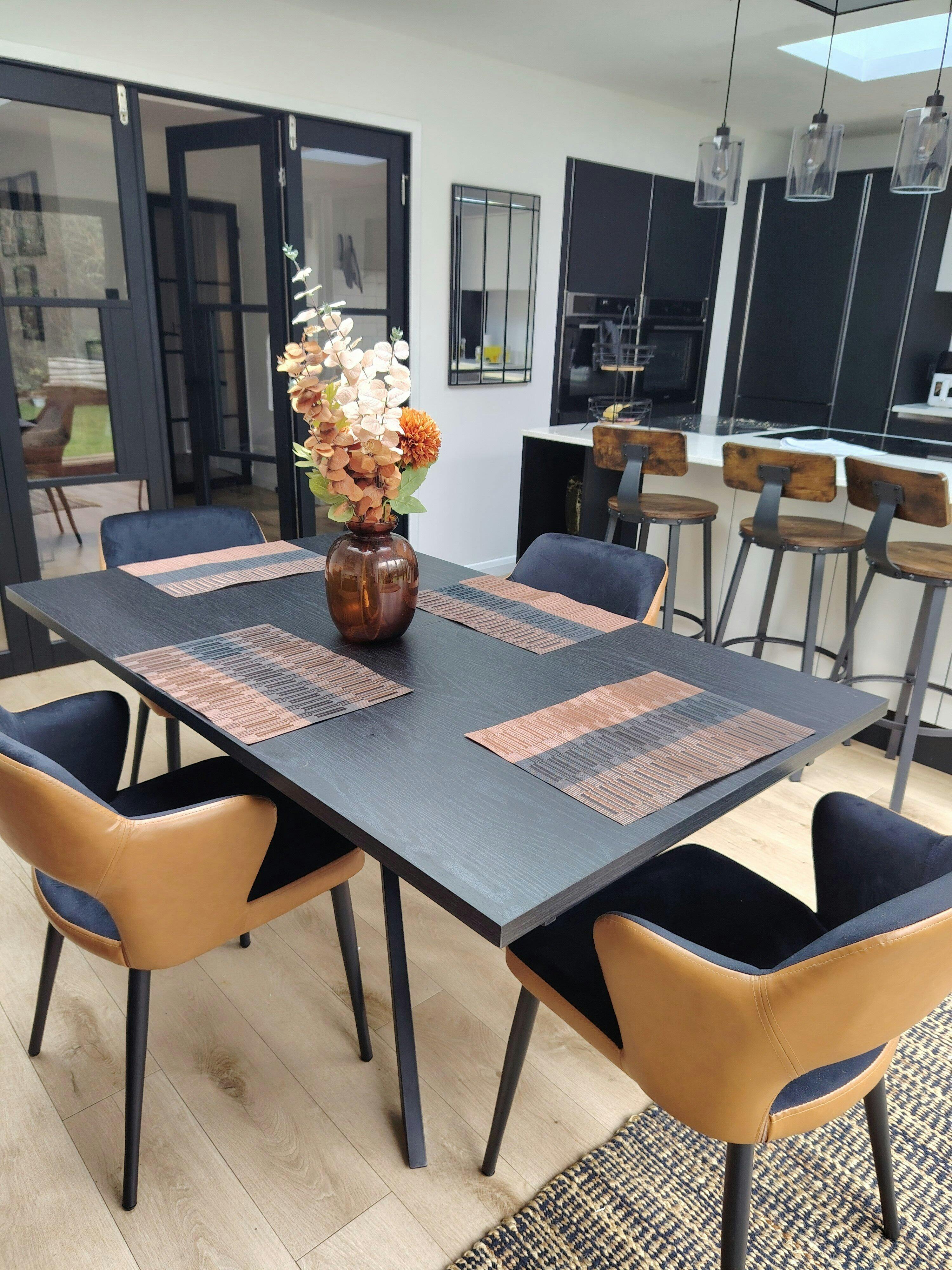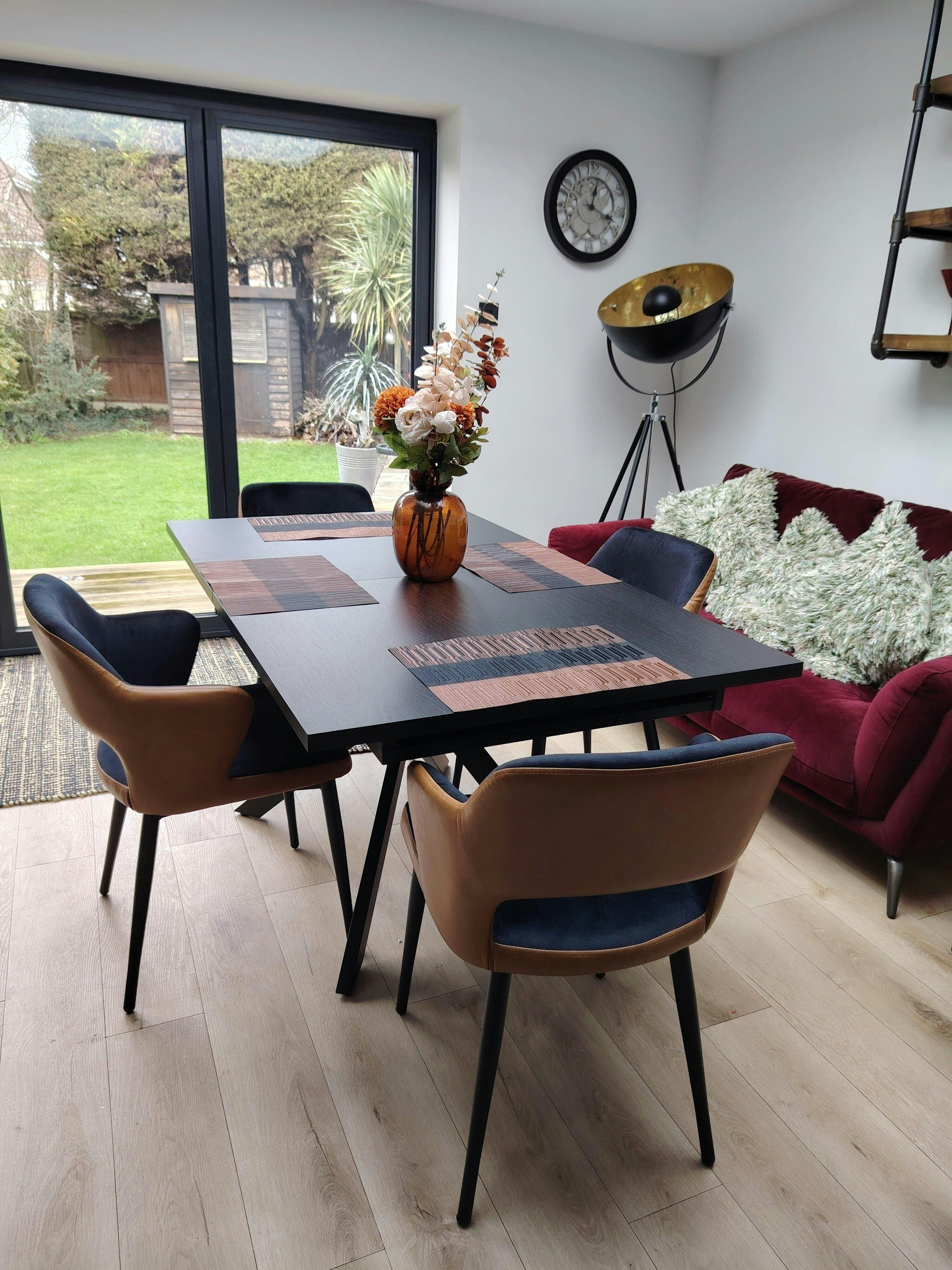 This stylish table can comfortably fit 6 people and then extend to fit up to 10 people when you have extra guests visiting. Choose between a grey stone effect top, oak effect top, or black wood effect top to match your dining room decor. Depending on your design preference, you can also pick either black metal legs or wood effect legs.