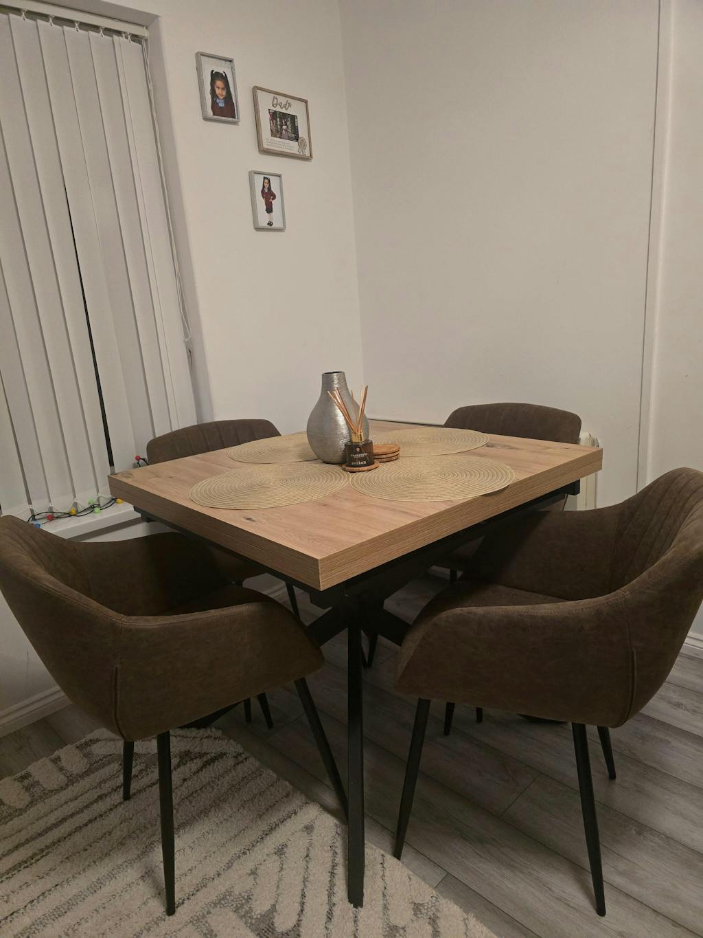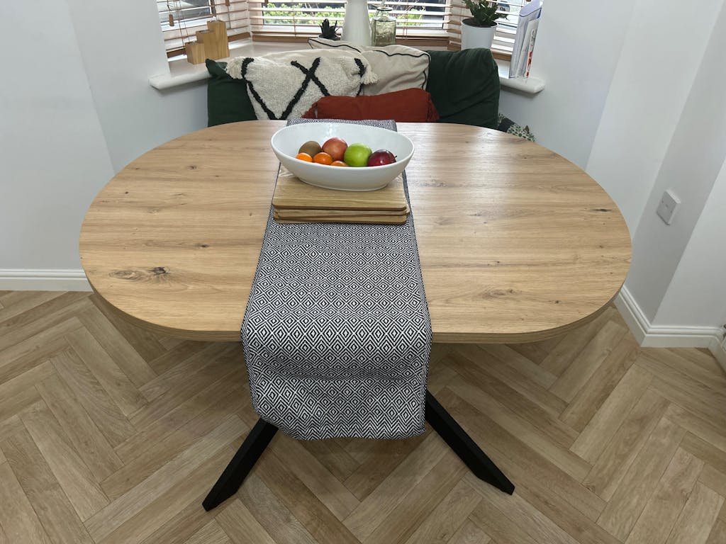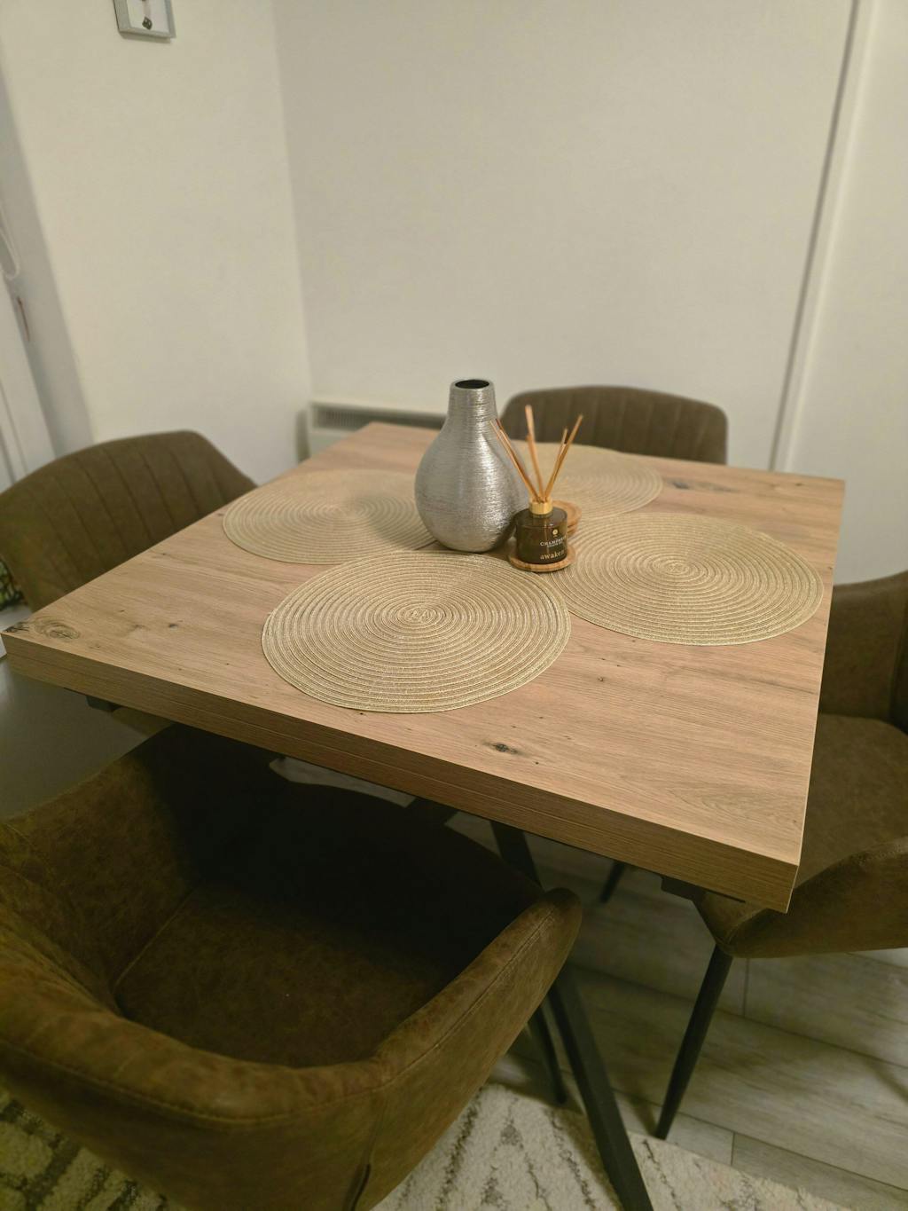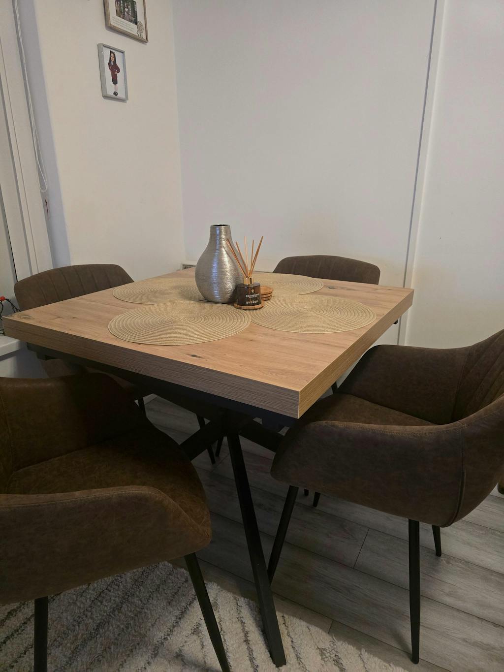 Start with the table in its compact, square shape, perfect for seating 4 people. To extend it, simply flip the tabletop to reveal an additional surface, turning it into a spacious rectangle. Slide the table pieces until the legs align in the centre, then press down on the latch to secure everything in place.