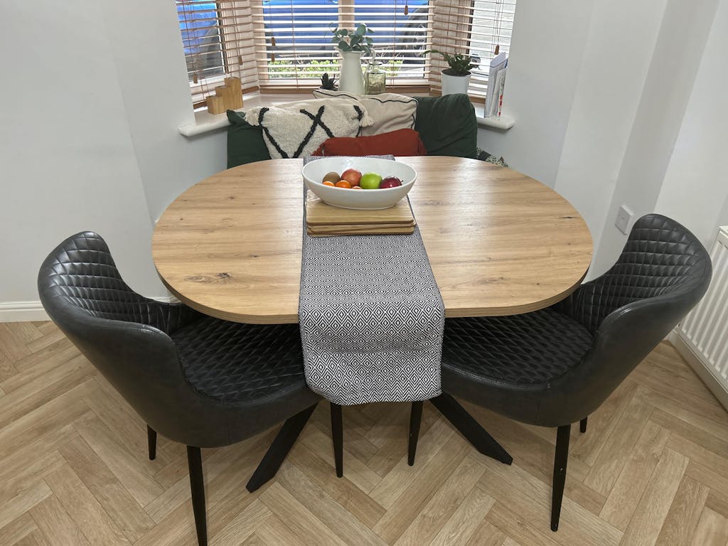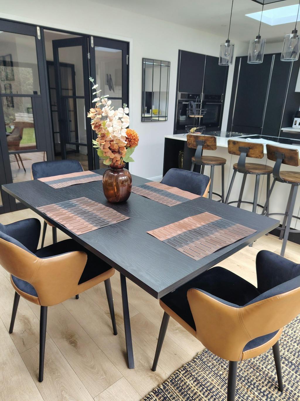 This stylish table can comfortably fit 4 people and then extend to fit up to 8 people when you have extra guests visiting. Choose between a grey stone effect top, oak effect top, or black wood effect top to match your dining room decor. Depending on your design preference, you can also pick either black metal legs or wood effect legs.