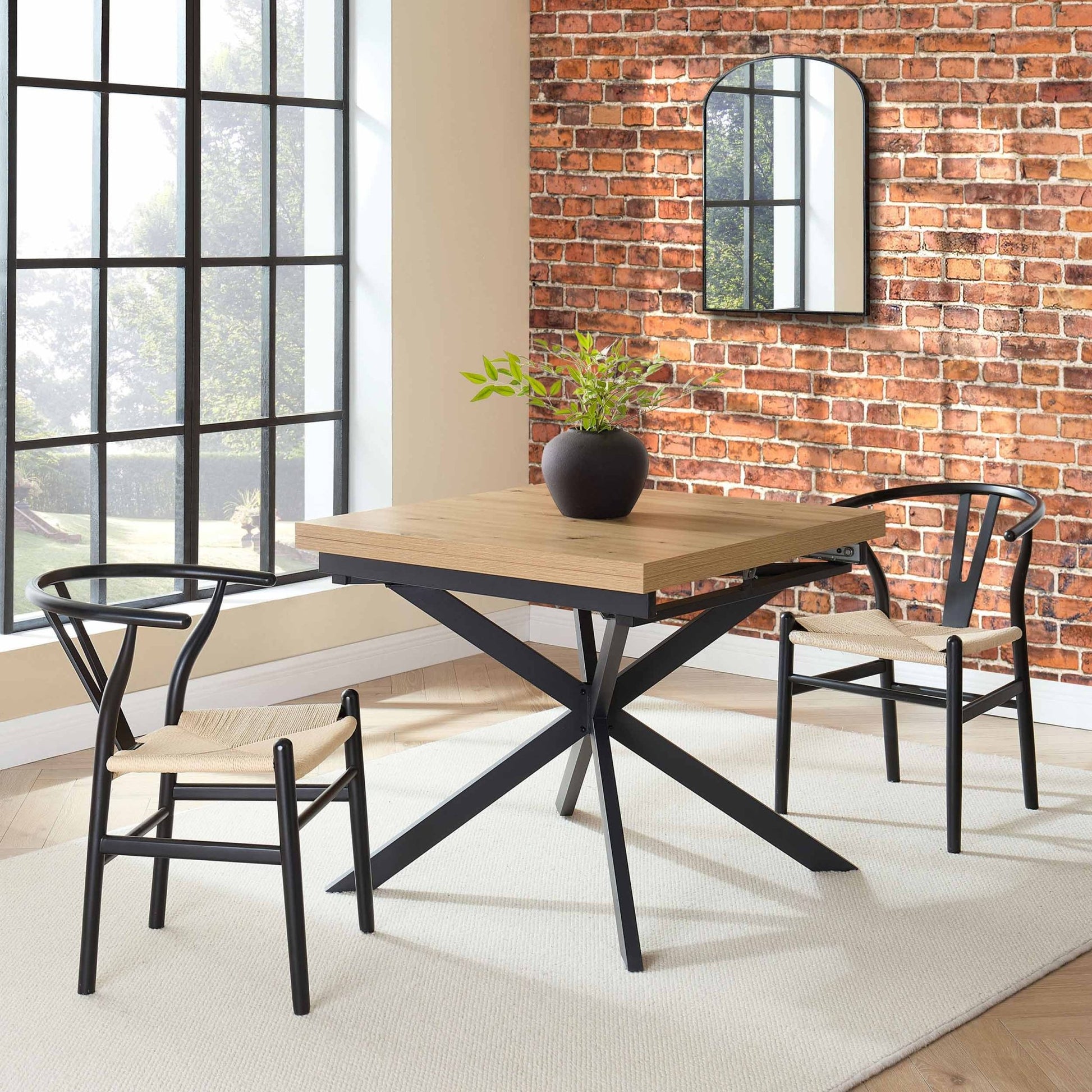 Start with the table in its compact, square shape, perfect for seating 4 people. To extend it, simply flip the tabletop to reveal an additional surface, turning it into a spacious rectangle. Slide the table pieces until the legs align in the centre, then press down on the latch to secure everything in place.