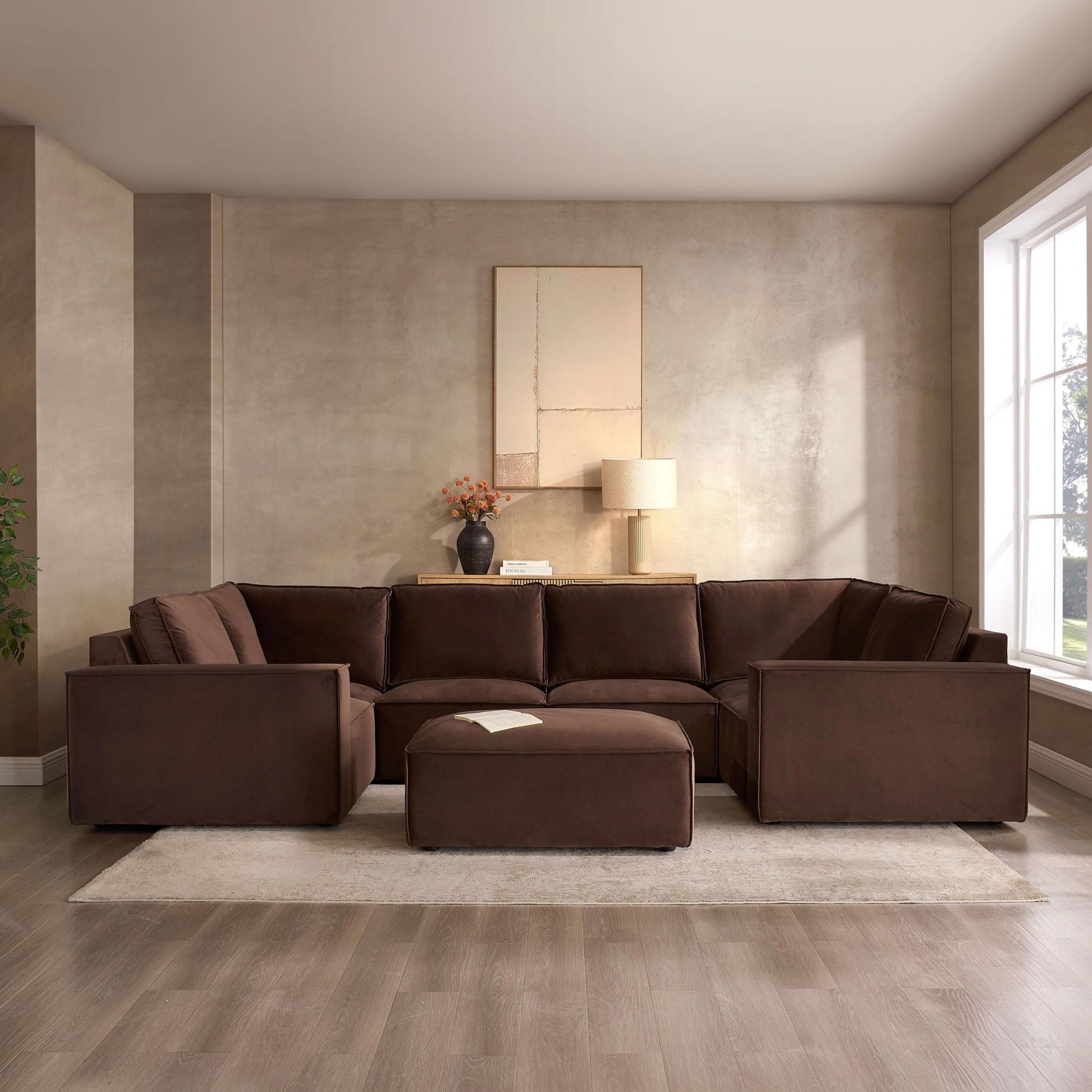 Made with a premium soft velvet fabric* in rich cappuccino, this u-shape sofa has smooth modern lines, and is a stunning addition to any living space. With fibre filled back cushions, and pocket sprung seats for unrivalled comfort and lasting durability, this sofa is the perfect place to enjoy every luxurious moment.
