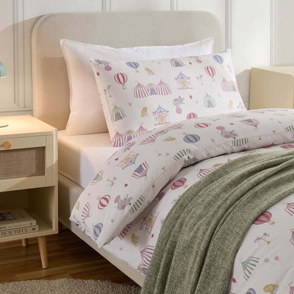 Bring the magic of the circus to your little one’s room with this playful bedding set, featuring charming illustrations of hot air balloons, striped tents, elephants and friendly lions. In a soft colour palette of red, blue, and pastel tones, it’s the perfect way to create a dreamy, adventure-filled bedtime.