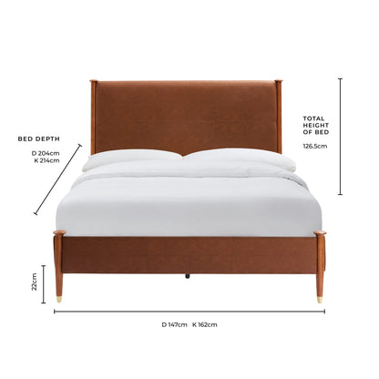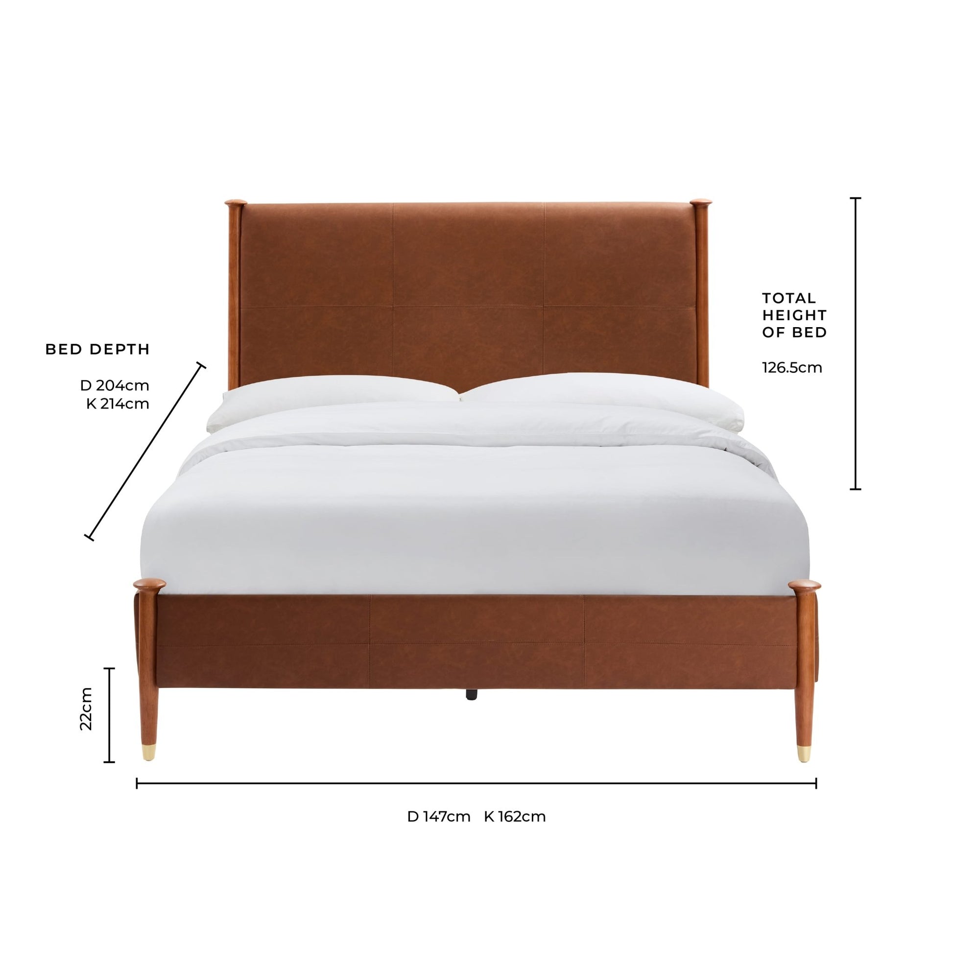 Upholstered in a warm Faux Leather, this bed frame brings a refined, modern edge to any bedroom, blending seamlessly with both minimalist and bold interiors. The clean lines, brass-style feet, and subtle texture of the PU material make it a standout piece while being easy to maintain.