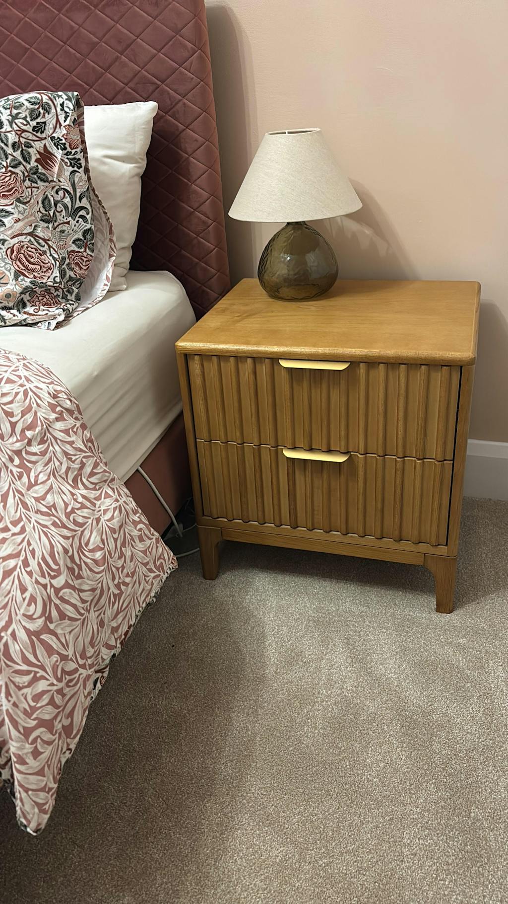 Crafted with care, the Elena Nightstand showcases a beautiful grooved design, available in wood, walnut, and mahogany finishes to suit any interior style. Its compact yet functional design provides a single spacious drawer for storing your bedside essentials, while its sleek lines and rich tones add a refined touch to your room. Made with a combination of durable solid wood and elegant veneer.
