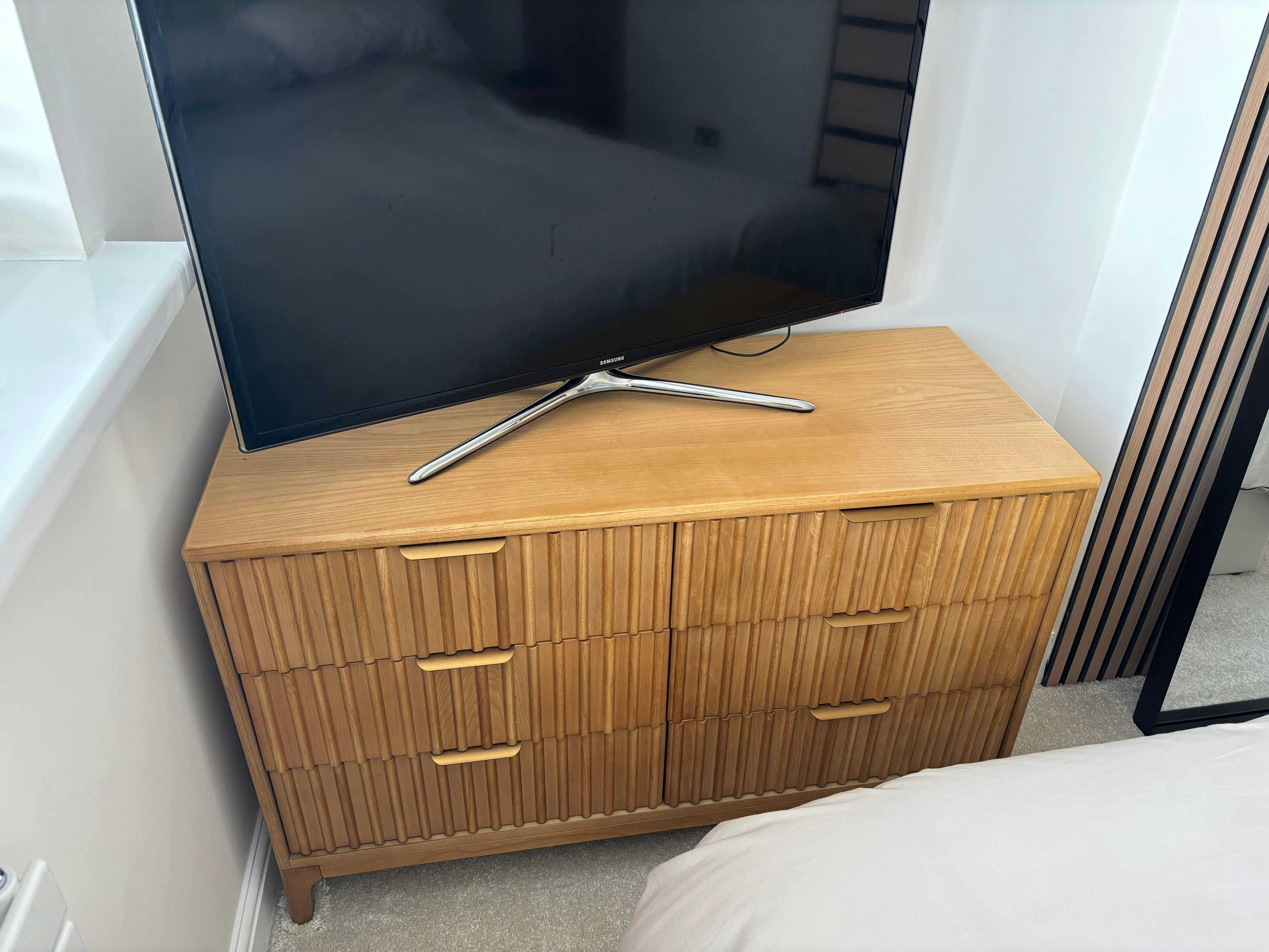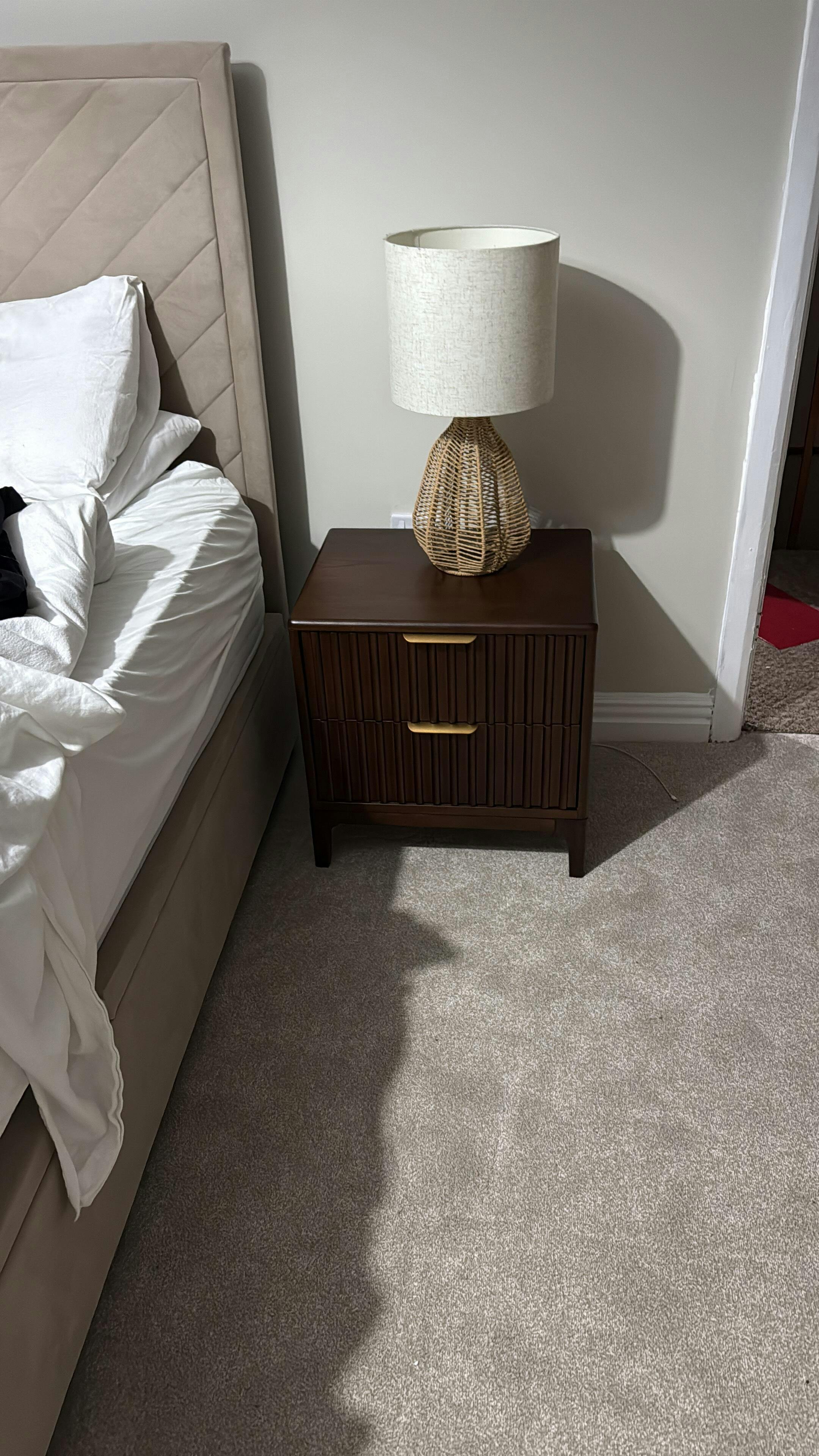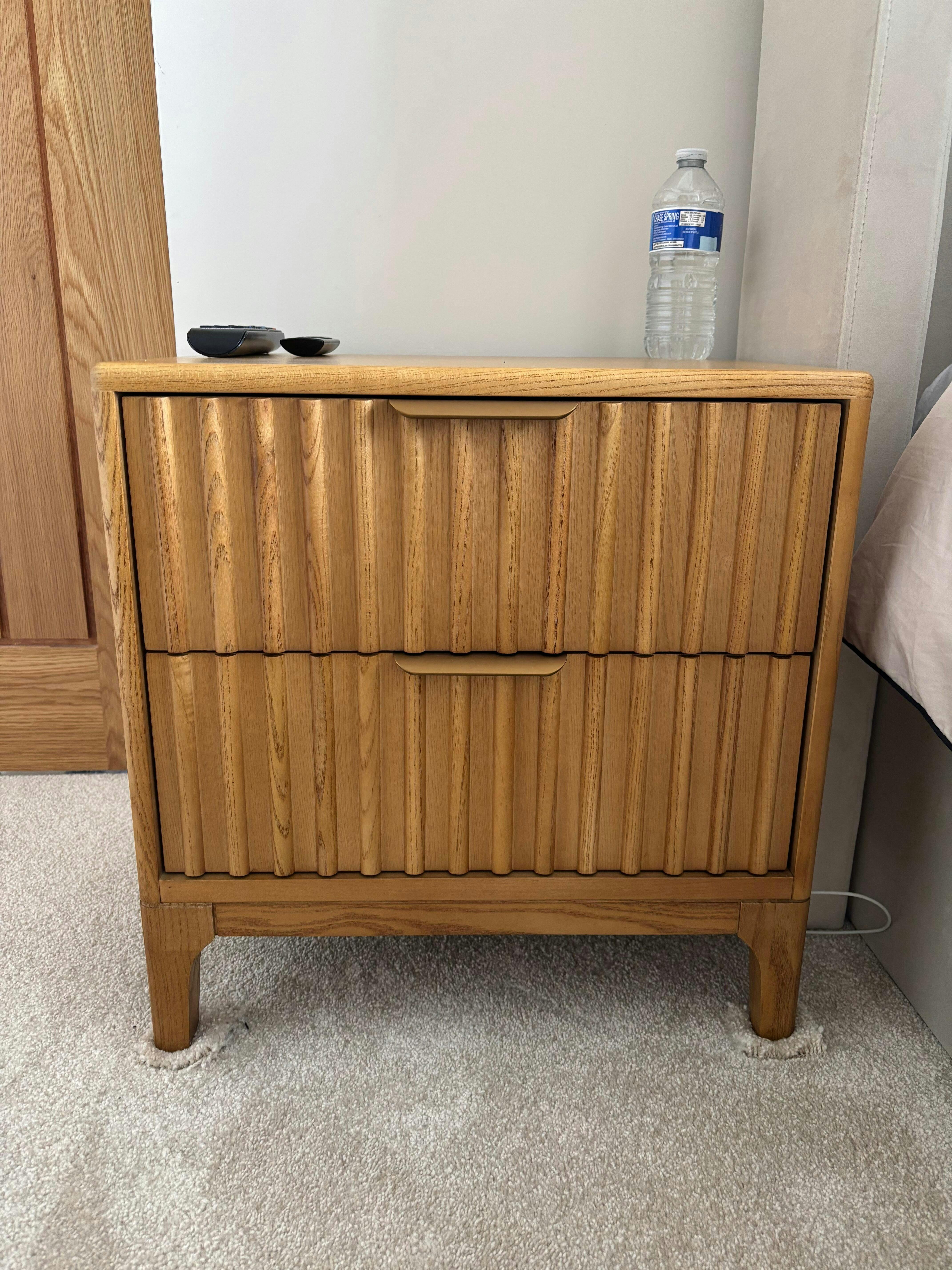 Crafted from solid wood and veneer with a grooved design, this bedside table is available in wood, walnut, or mahogany finishes to suit any decor. The two drawers offer ample space to store essentials, while the tabletop can hold a table lamp and your latest book. Made with a combination of durable solid wood and elegant veneer.