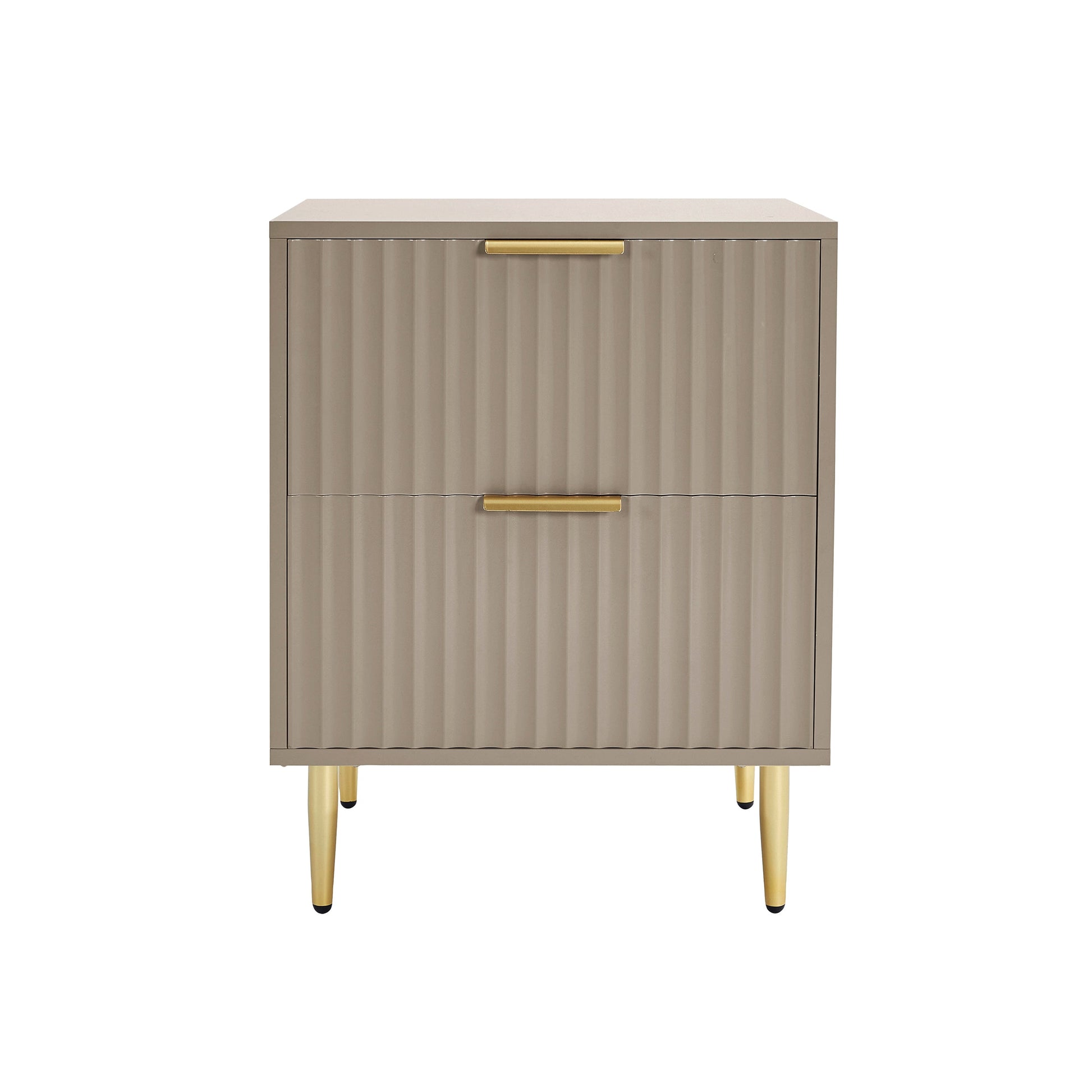 The ultimate in stylish versatility, this 2 drawer bedside table is practical, stunning and built to last. Delivered flat packed, it has durable metal drawer runners, and is the perfect place to keep all of your essentials to hand as you relax and unwind. With a matte-white painted finish, this bedside table has gold-effect legs and cylindrical handles.