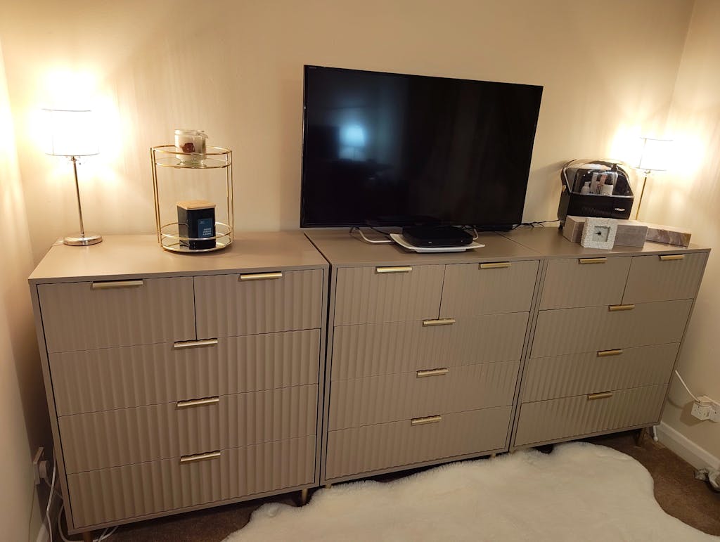 Delivered flat packed, let this chest of 3 drawers really set the tone for your home. With plenty of storage for all of your favourite things, this chest has smooth, curved lines, a distinctive symmetrical ridged design, and a matte-black painted finish for a contemporary look and feel. For lasting ease and durability, the drawers have metal drawer runners, whilst gold-effect legs and cylindrical handles add a touch of colour.