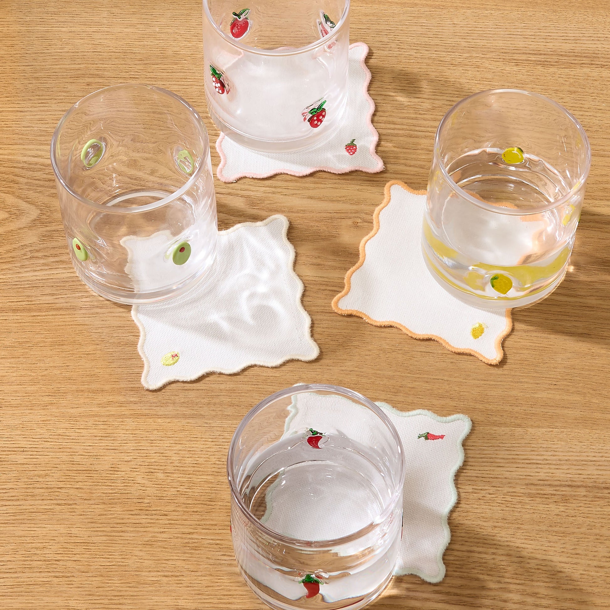 Crafted from clear soda lime glass, these tumblers are dotted with charming fruity motifs, from bright strawberries and lemons to olives and chillies, each adding a cheerful pop of colour. The clean, rounded silhouette keeps the look fresh and modern, while the playful detailing makes every drink feel a touch more fun.