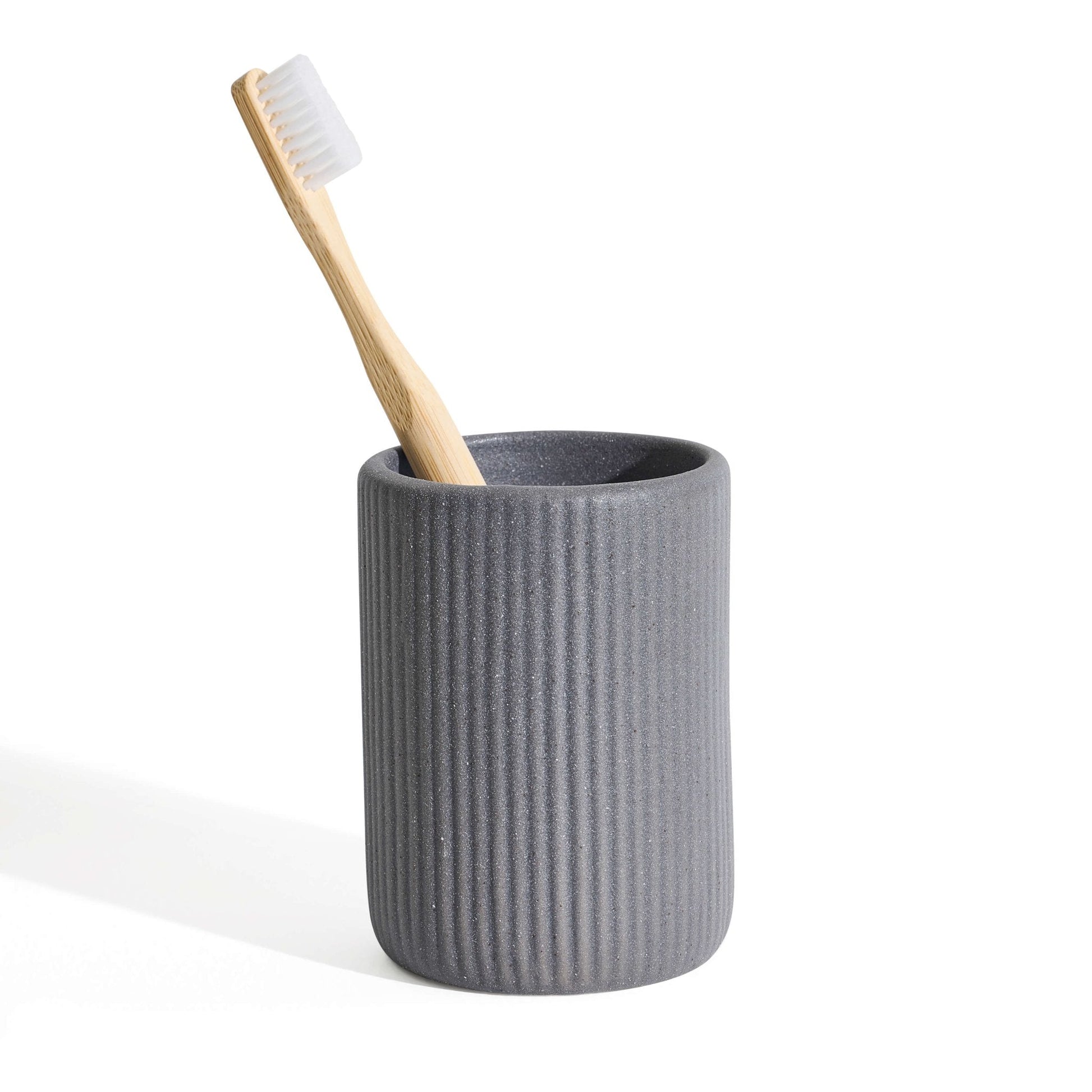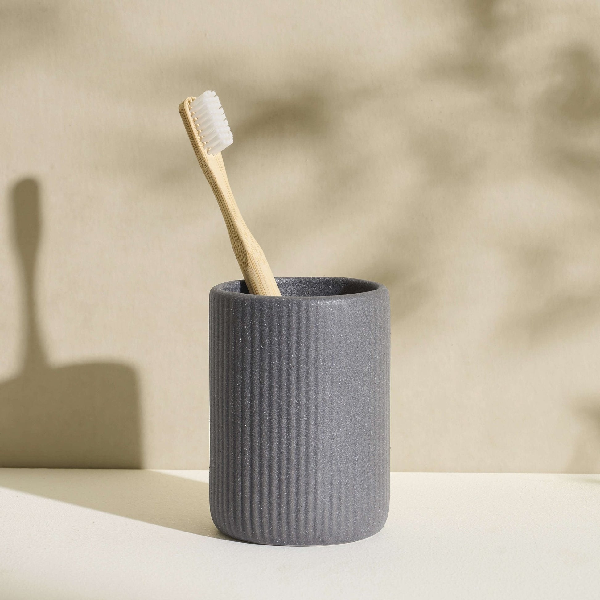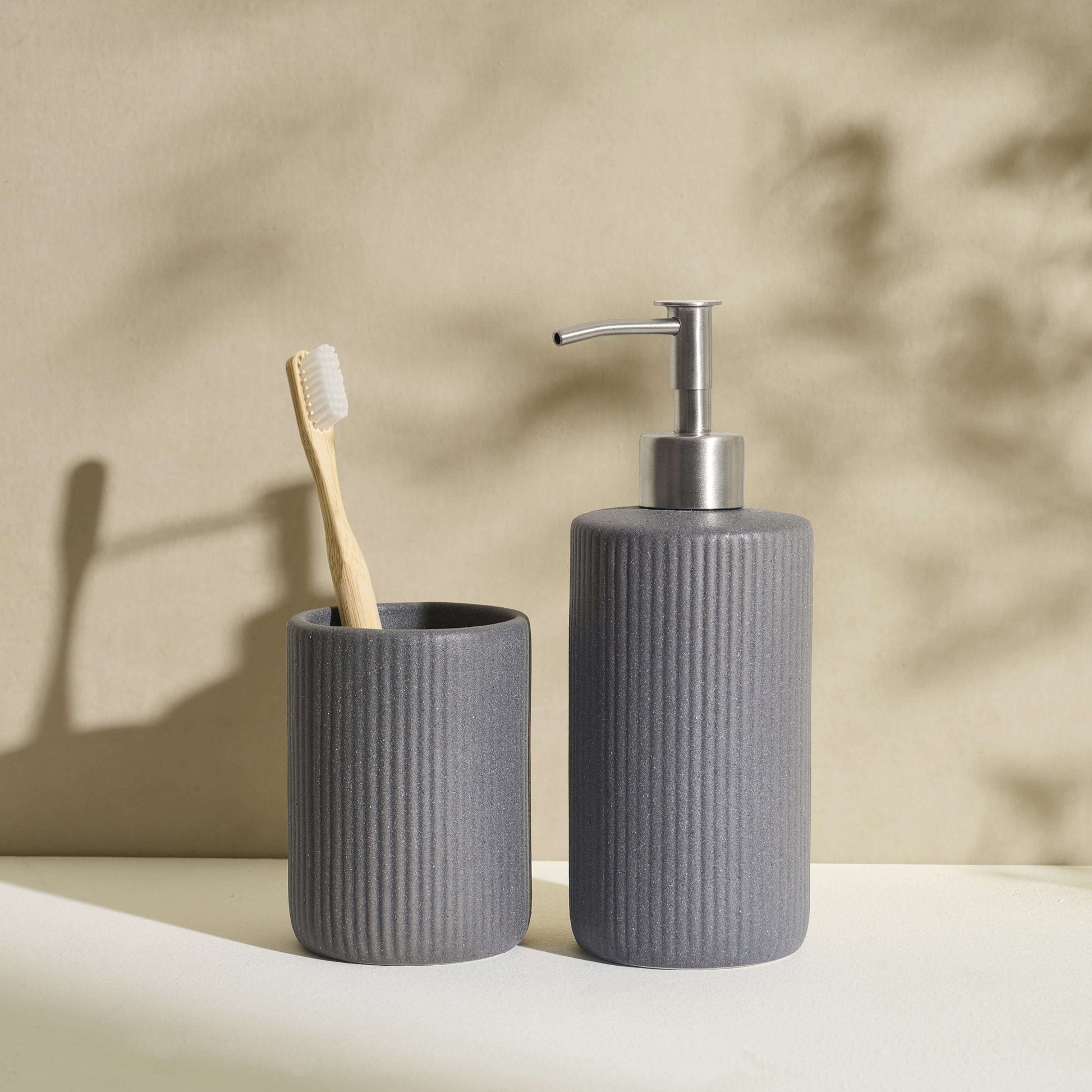 With softly ribbed stoneware and a tactile sand-effect finish, each piece adds subtle texture to your sink-side set-up. The dispenser features a sleek silver pump for a clean, modern touch, while the matching tumbler is ideal for toothbrushes or makeup brushes.