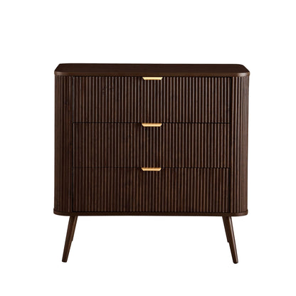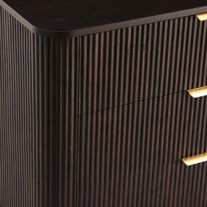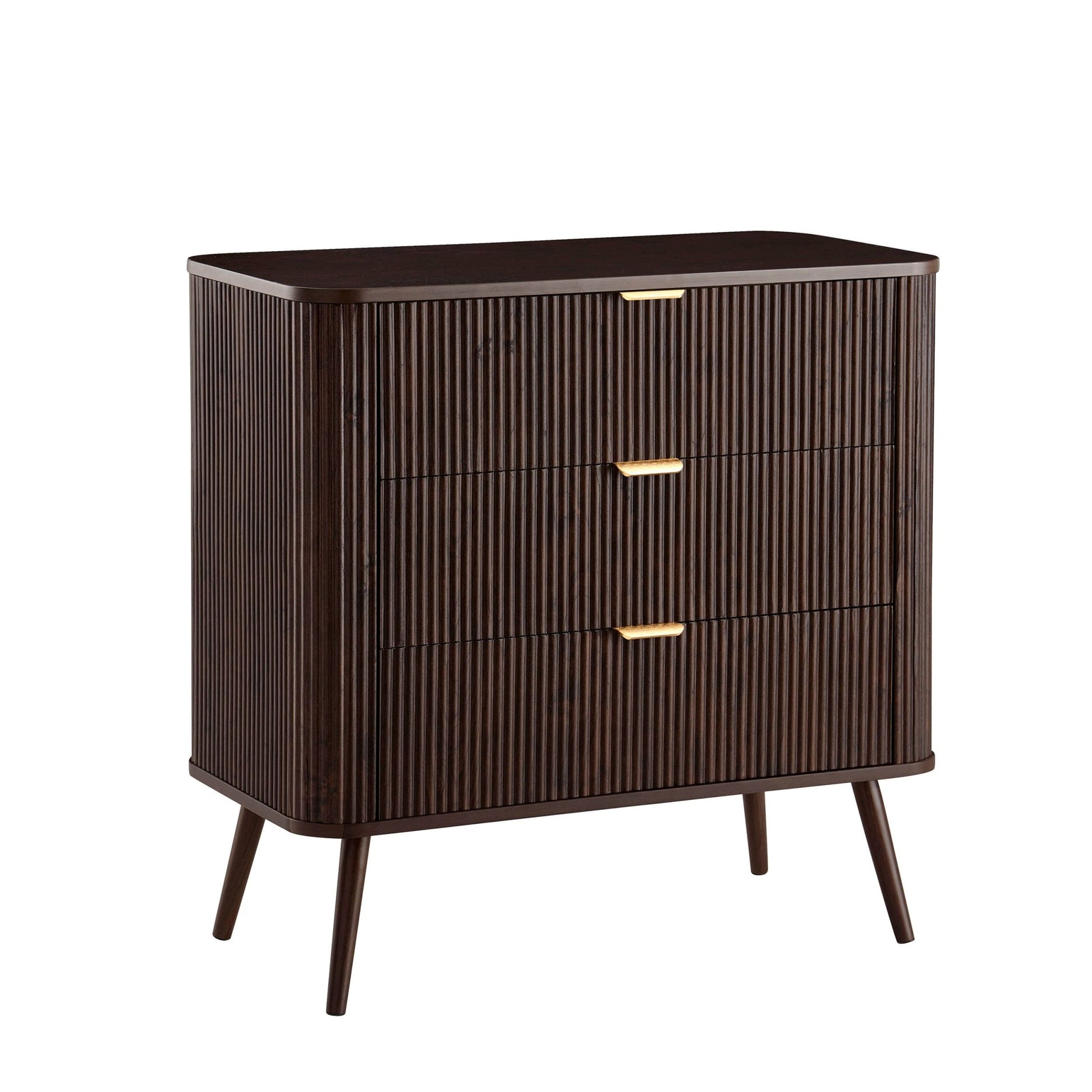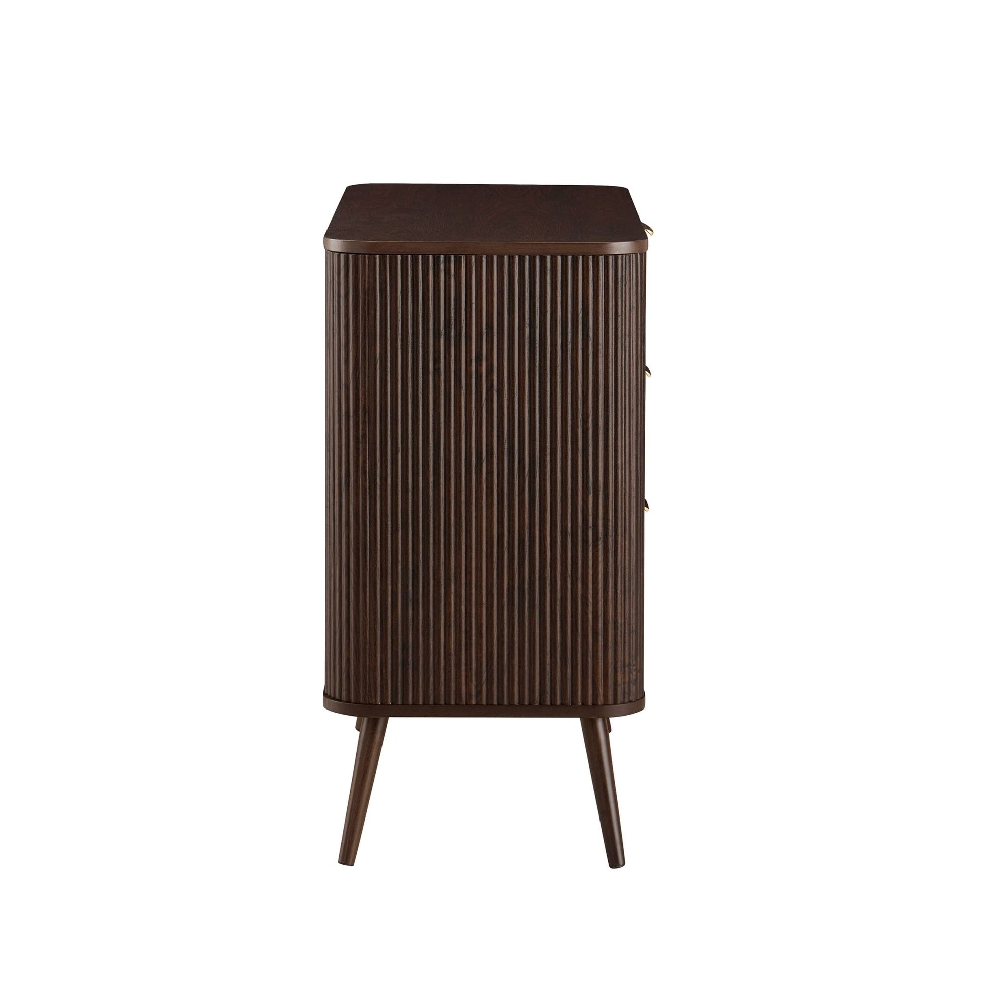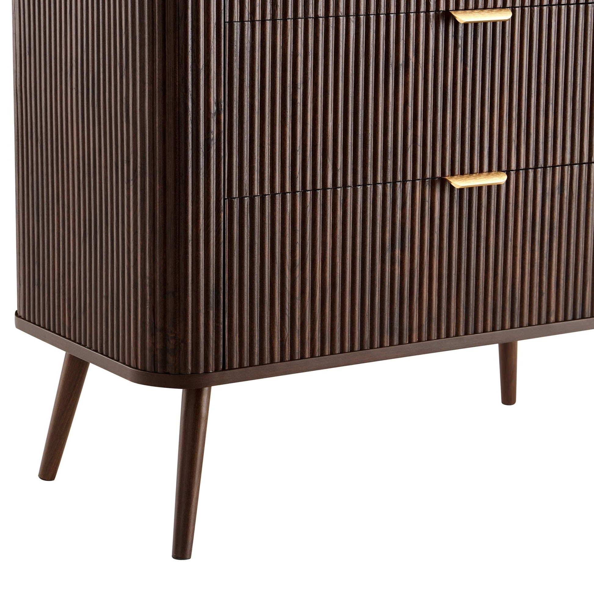 With its soft, rounded edges, sleek brass handles and signature grooved finish, this chest of drawers brings a touch of quiet luxury to any corner of the home.