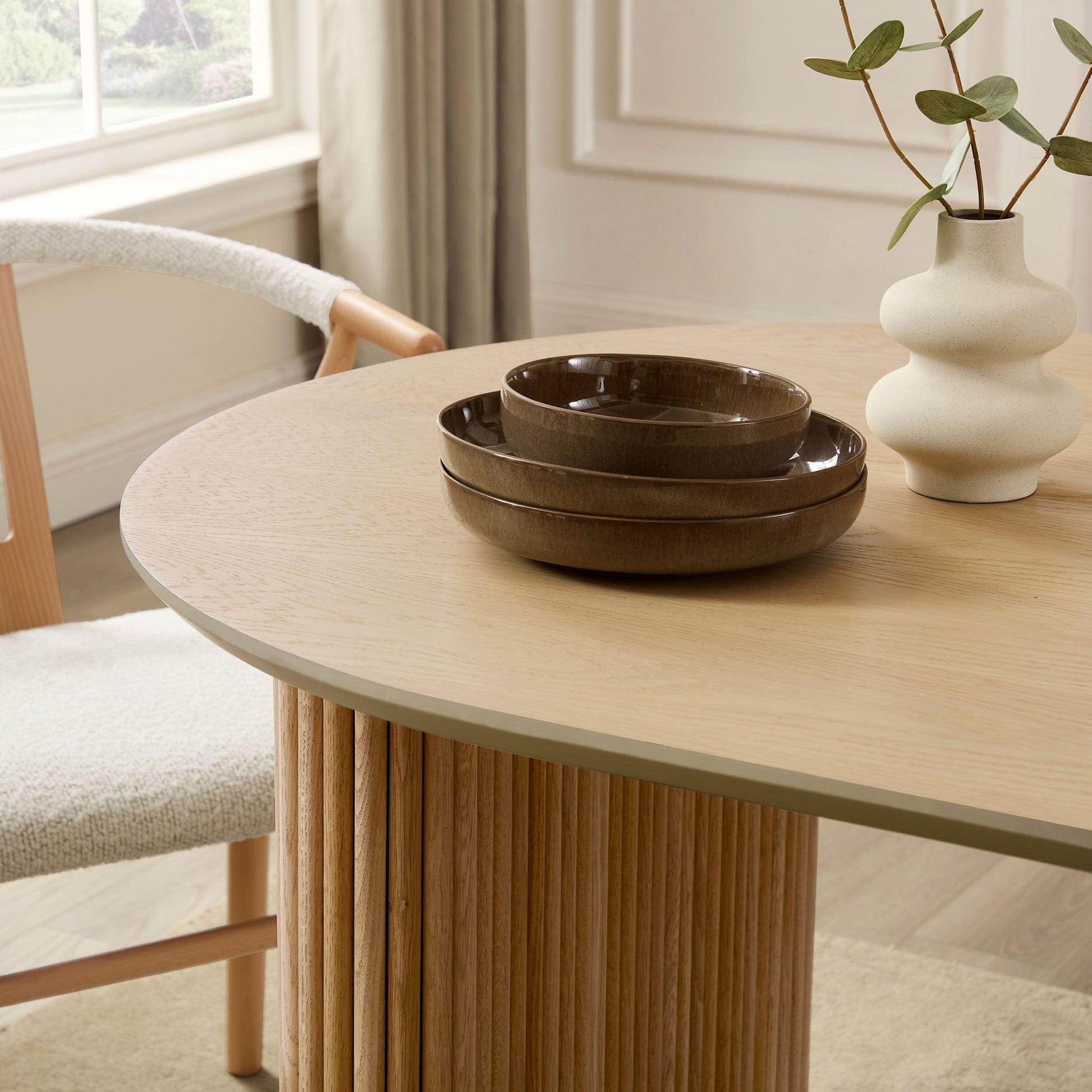 Whether you’re entertaining friends and family or making mealtimes a little more cosy, the Hattie dining table is the perfect addition to any home interior. With room for 6 people, it’s made with a natural and durable wood veneer finish, and has a stunning oval shaped top for soft, smooth look and feel. Beautifully designed, slim wooden panels at each side create eye-catching style and a contemporary contrast.