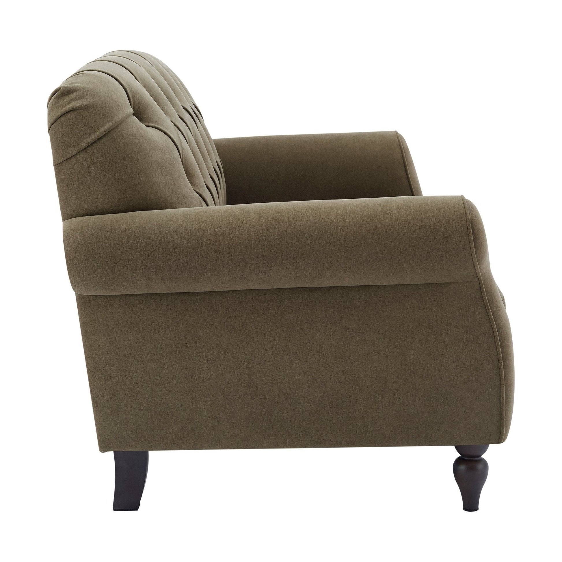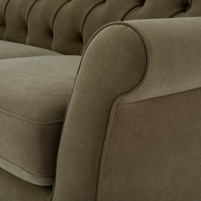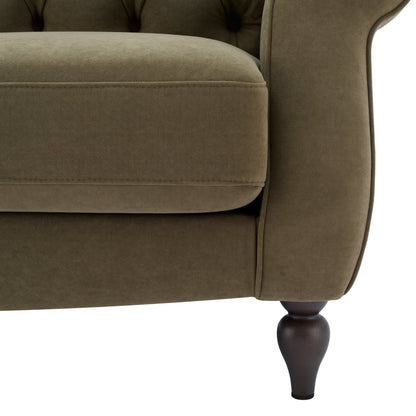 Crafted with a luxurious premium matte velvet fabric in a warm and subtle shade of olive, it has a beautiful button back detail, as well as roll top arms and natural wood effect legs.