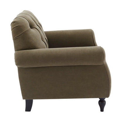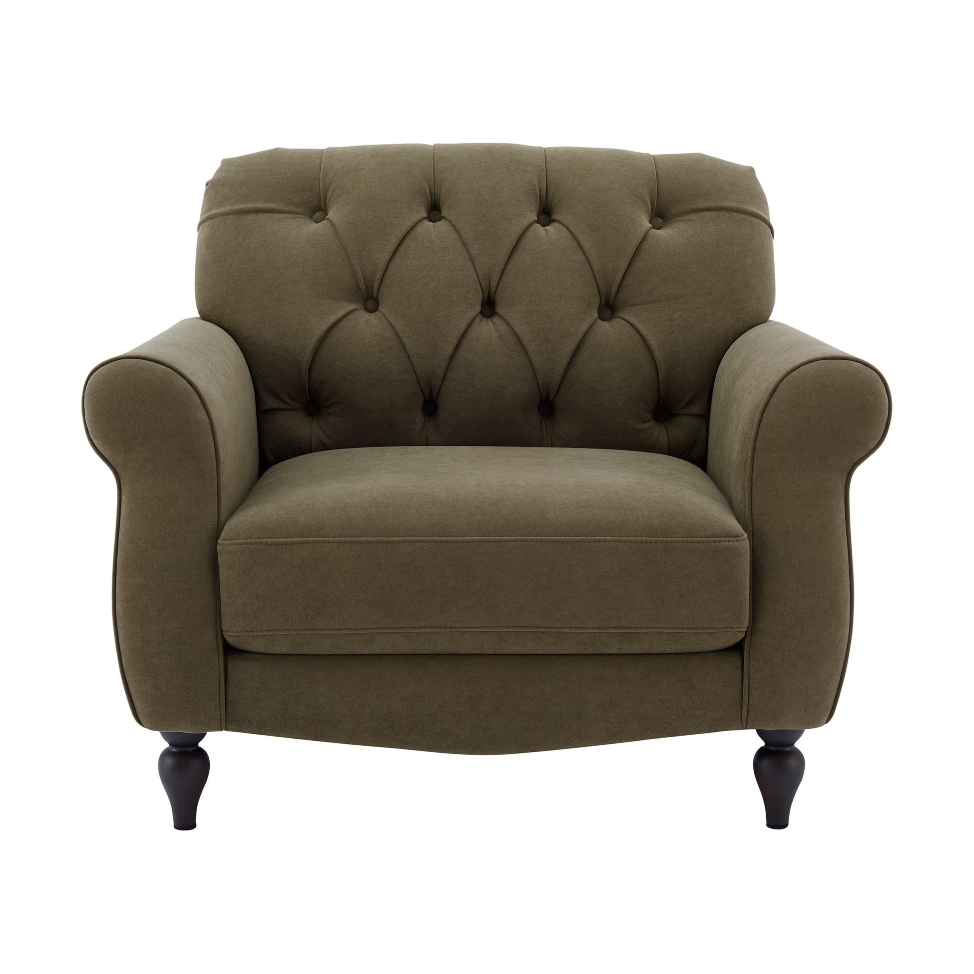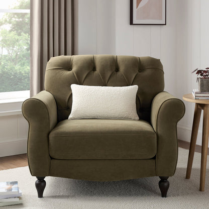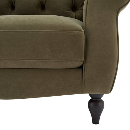 Crafted with a luxurious premium matte velvet fabric in an olive green, it has a beautiful button back detail, as well as roll top arms and natural wood effect legs.