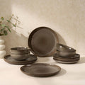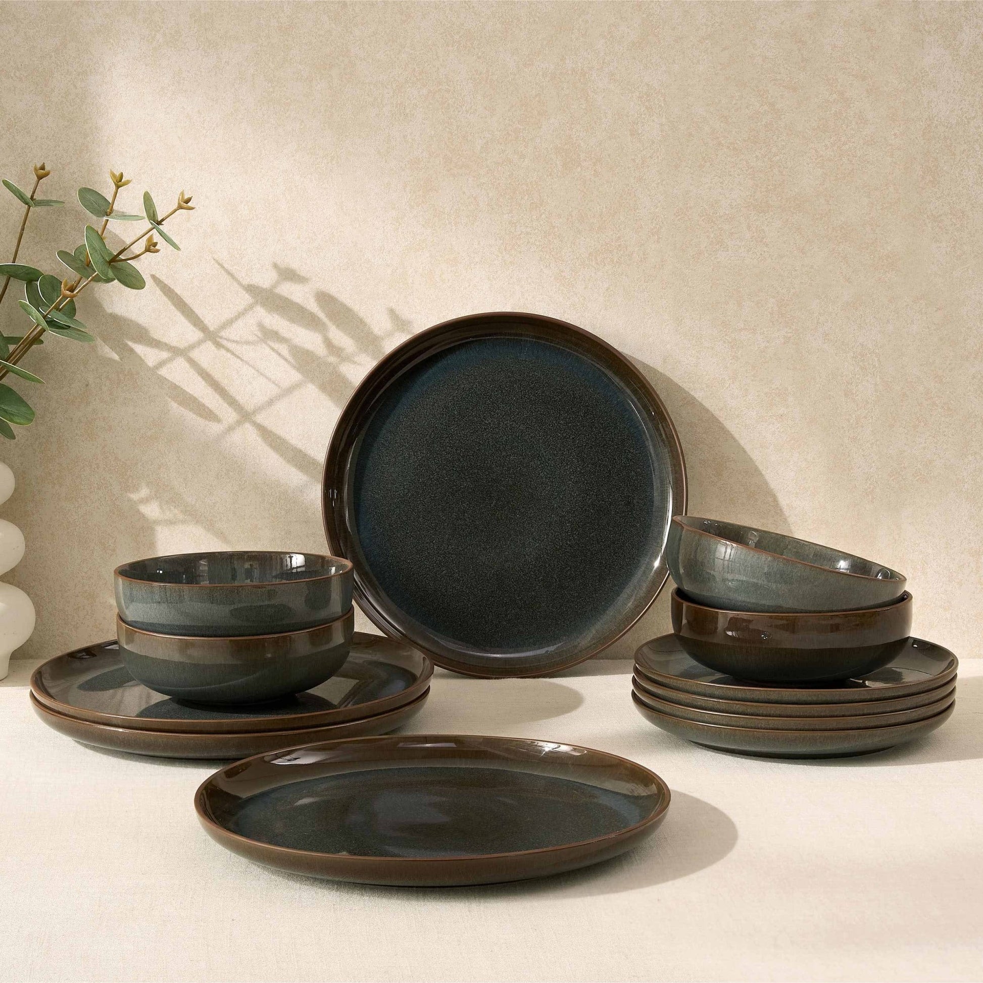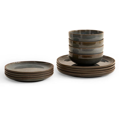 This 12-piece stoneware set includes side plates, cereal bowls and dinner plates, all finished with our signature reactive glaze for a rich, artisanal look. In soft Grey/Blue or earthy Mocha, each piece feels uniquely crafted, adding subtle texture and depth to your table. The earthy tones pair beautifully with natural linens, soft candlelight and seasonal florals.