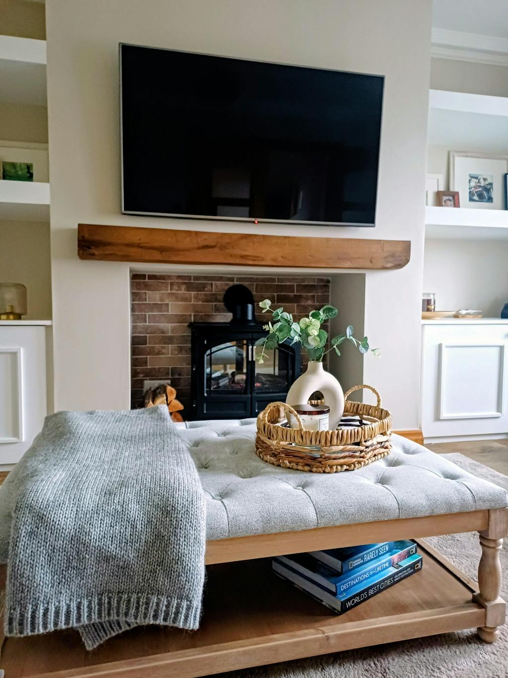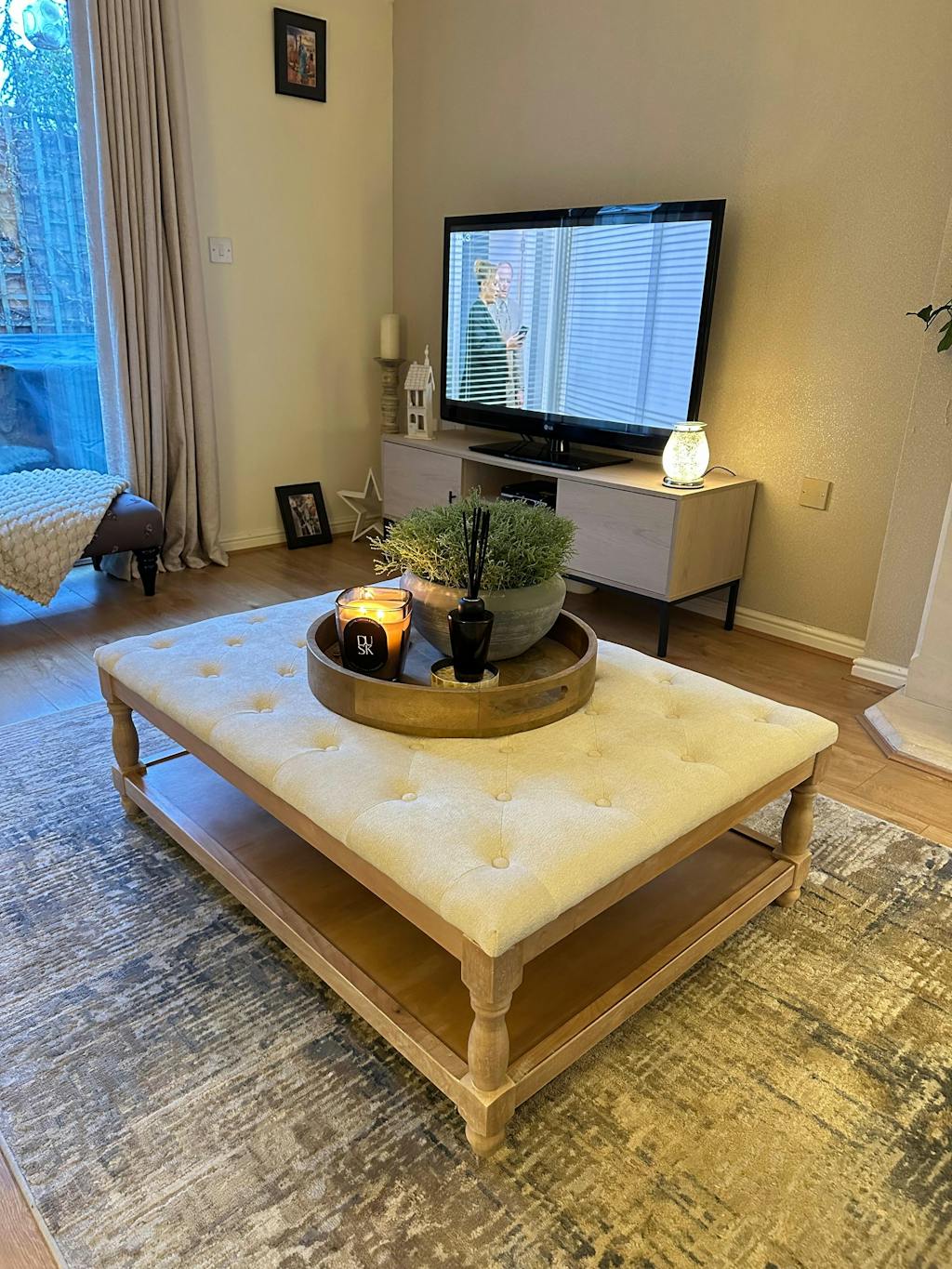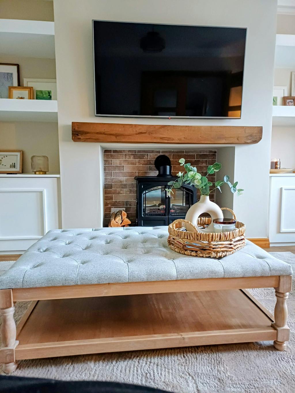 This unique living room table blends the softness of a cushioned top with the structure of a timeless coffee table. Upholstered in a classic button-tufted fabric, it offers a refined spot to rest a tray, pop your feet up or style with books and candles.