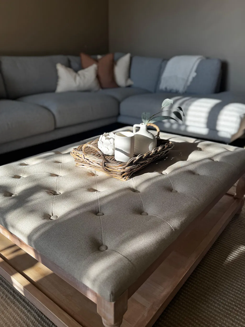 This unique living room table blends the softness of a cushioned top with the structure of a timeless coffee table. Upholstered in a classic button-tufted fabric, it offers a refined spot to rest a tray, pop your feet up or style with books and candles.
