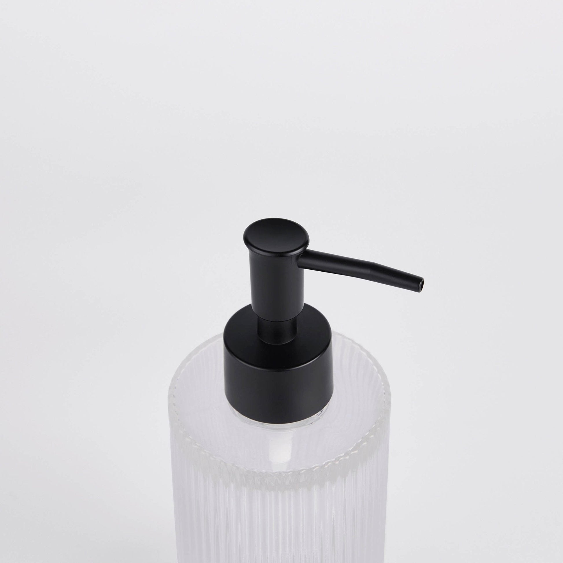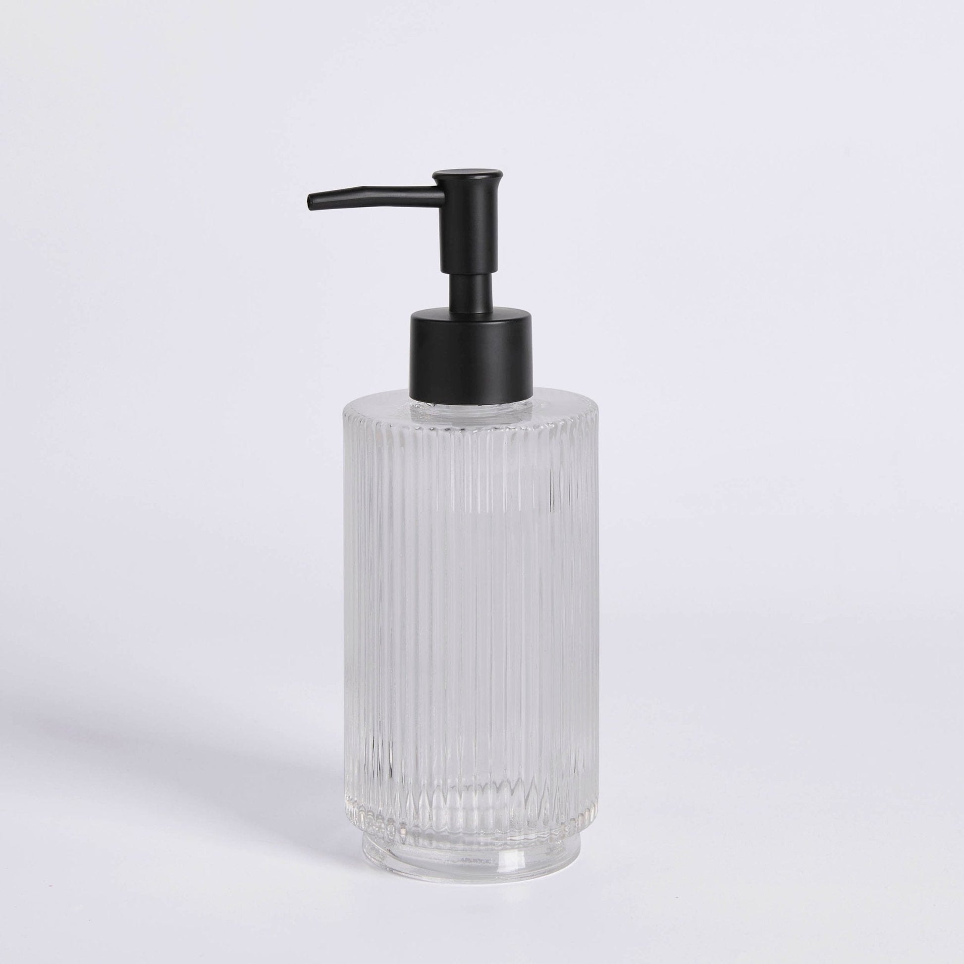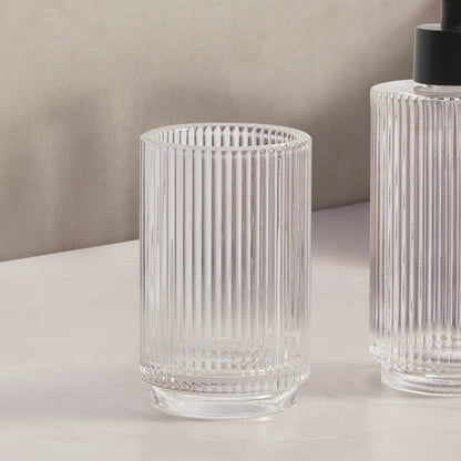 The Lena bathroom set pairs a sleek soap dispenser with a coordinating tumbler, both crafted from weighty ribbed glass that reflects light beautifully. The dispenser’s matte black pump adds a bold, modern contrast, while the tumbler is just right for toothbrushes or makeup brushes. This is a chic, understated upgrade for your everyday essentials.
