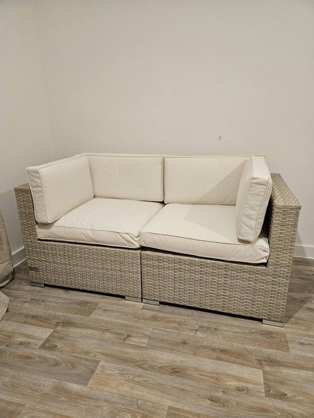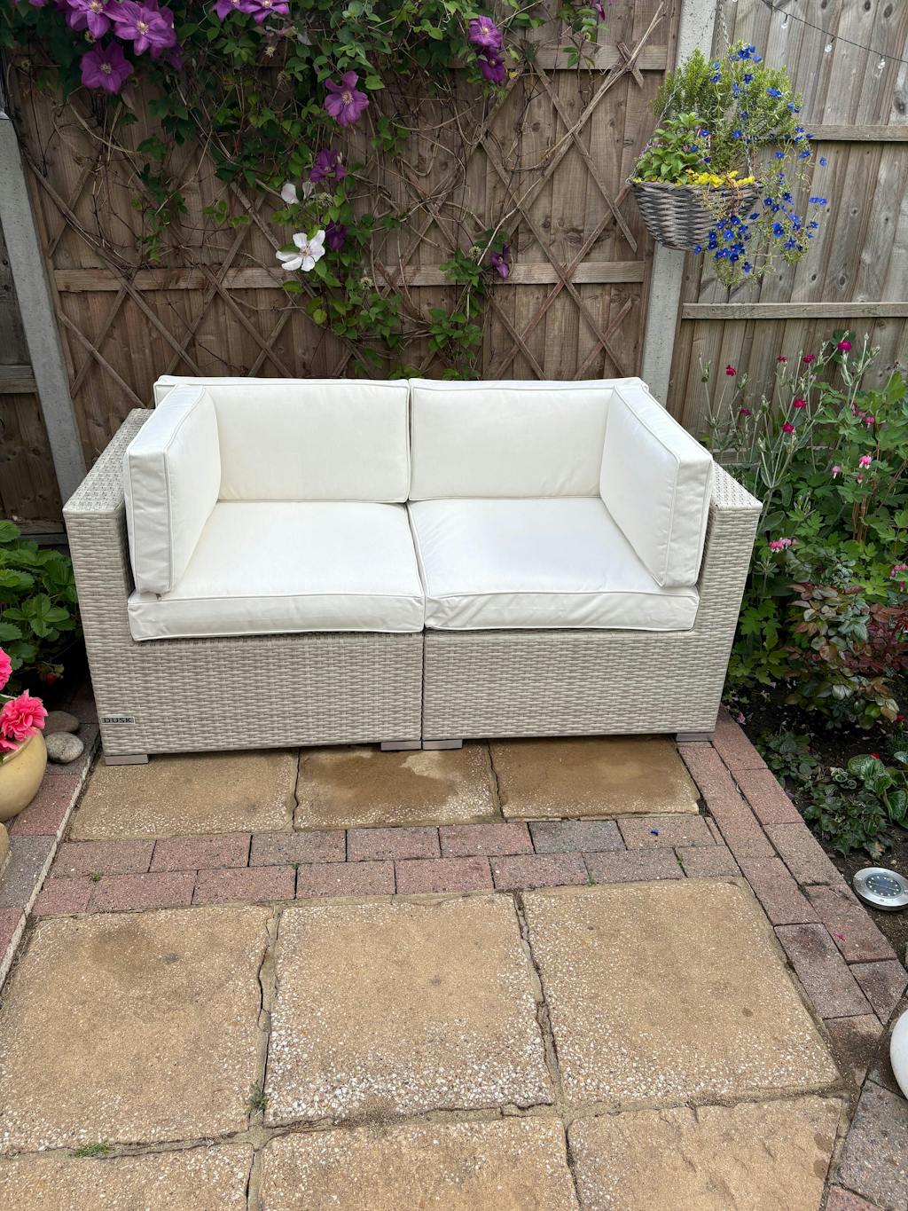 Curl up and soak up summer with the 2-seater garden sofa from the Lisbon collection in natural.