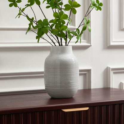 Crafted from luxury stoneware with a glazed finish, these vases feature a delicate ribbed texture that adds depth and character to any space. Their neutral grey/white tone makes them effortlessly versatile - style them as a pair for a statement look or display solo with fresh or dried flowers.