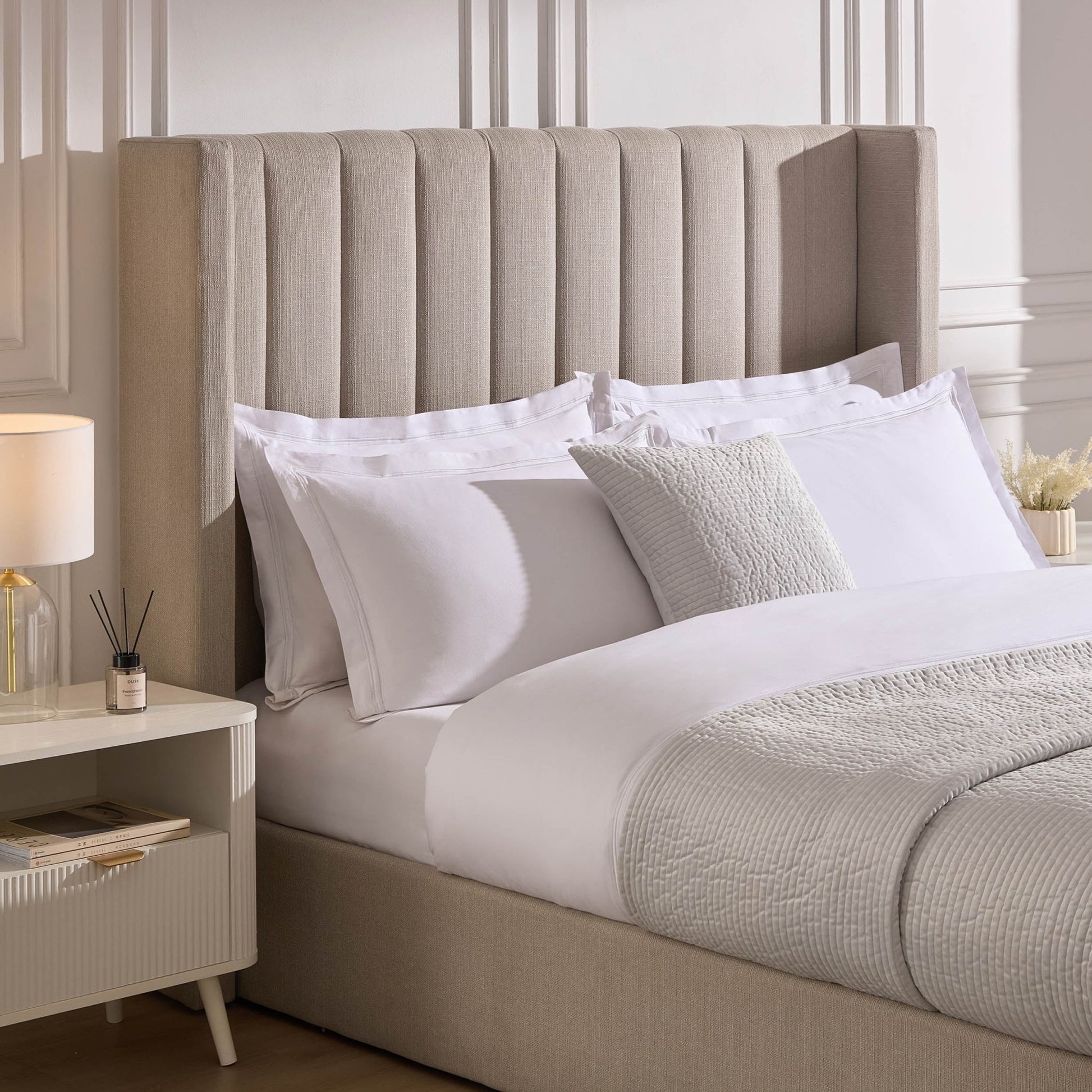 The simple, elegant shape hides a clever storage solution, in its generous underbed space. Simply lift from the foot of the bed to reveal ample room for extra bedding, towels and pillows all effortlessly stored away.