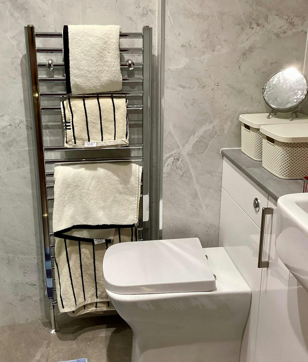 Upgrade your bathroom with the timeless elegance of the Madrid Fine Stripe Towels.