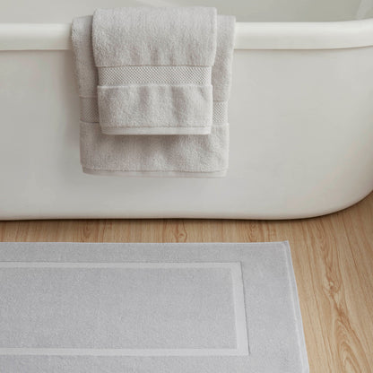 Crafted from high-quality materials, the absorbent surface dries quickly after every shower or bath. Its minimalist design, with a subtle border pattern, adds a sophisticated look that complements any bathroom decor.