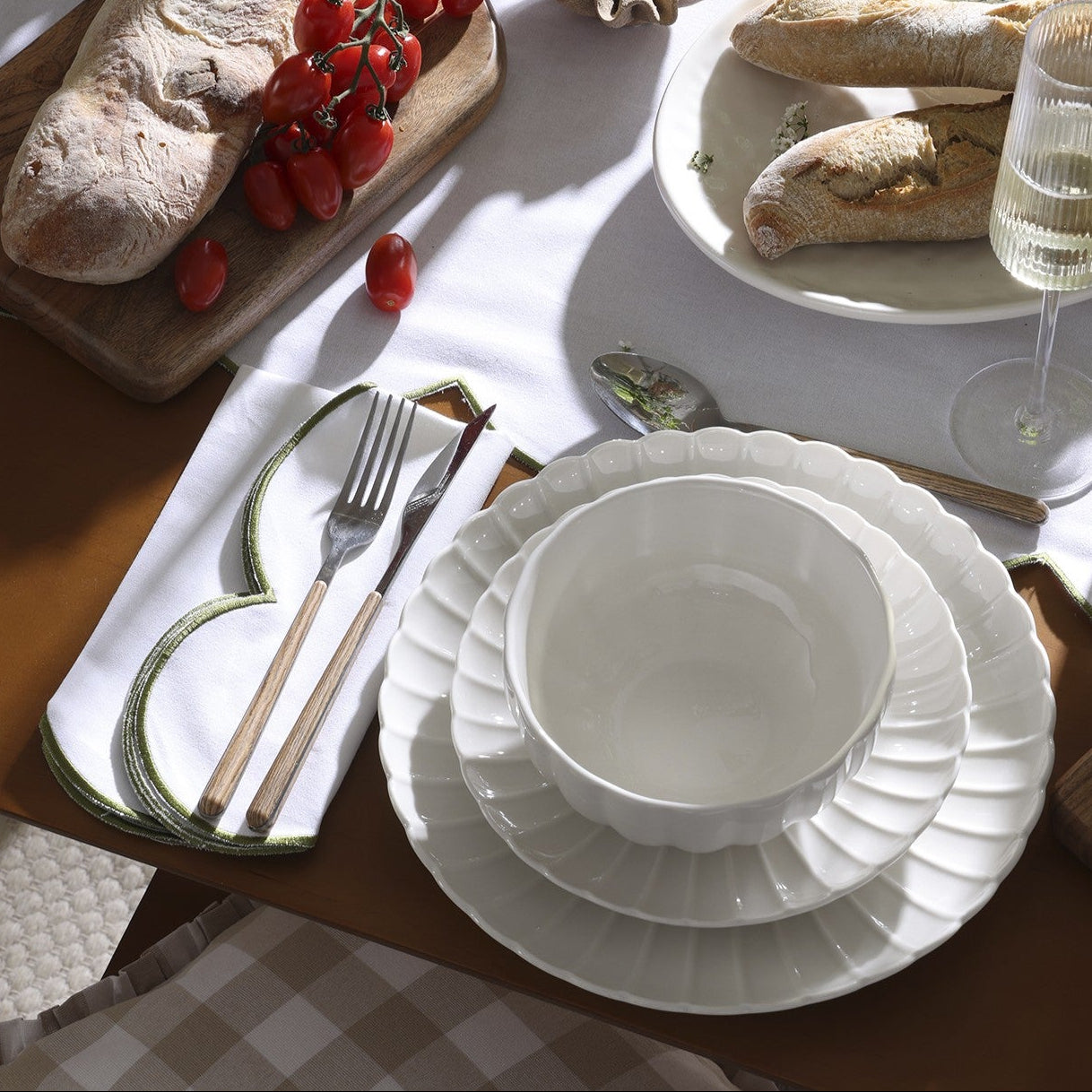 Style them with the Simone Scallop Table Linen to channel a French Chateau vibe and create a dining setup that’s effortlessly chic.