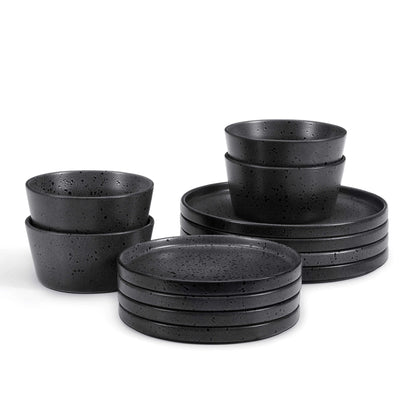 The Nori 12 Piece Dinner Set includes four dinner plates, four side plates, and four cereal bowls, each crafted from durable stoneware with a deep matte blue/black glaze and subtle speckled texture. Clean lines and a modern dark style give these pieces a contemporary feel to any table.