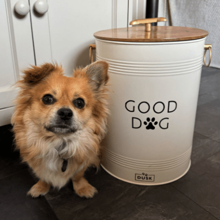 Crafted with a durable metal body and a warm acacia wood lid, this storage bucket is perfect for keeping dry dog food fresh and neatly stored. Its "Good Dog" print and golden accents add a touch of charm to any kitchen or utility room. You can find these useful buckets in both medium and large sizes.