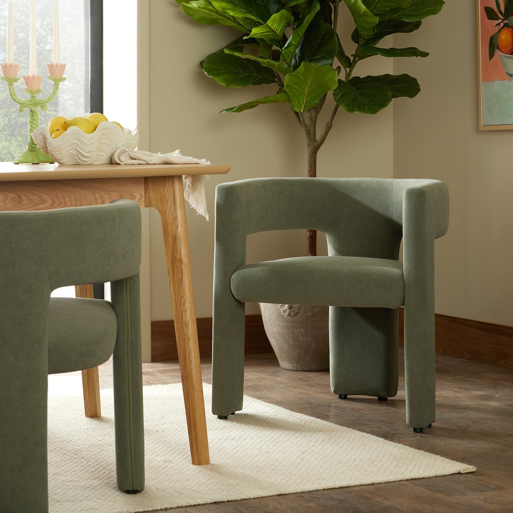 Designed in matte velvet, feel the soft fabric of the Quinn chair beneath you while you enjoy mealtimes. The chair's shape offers gentle support from the curved backrest and armrests.