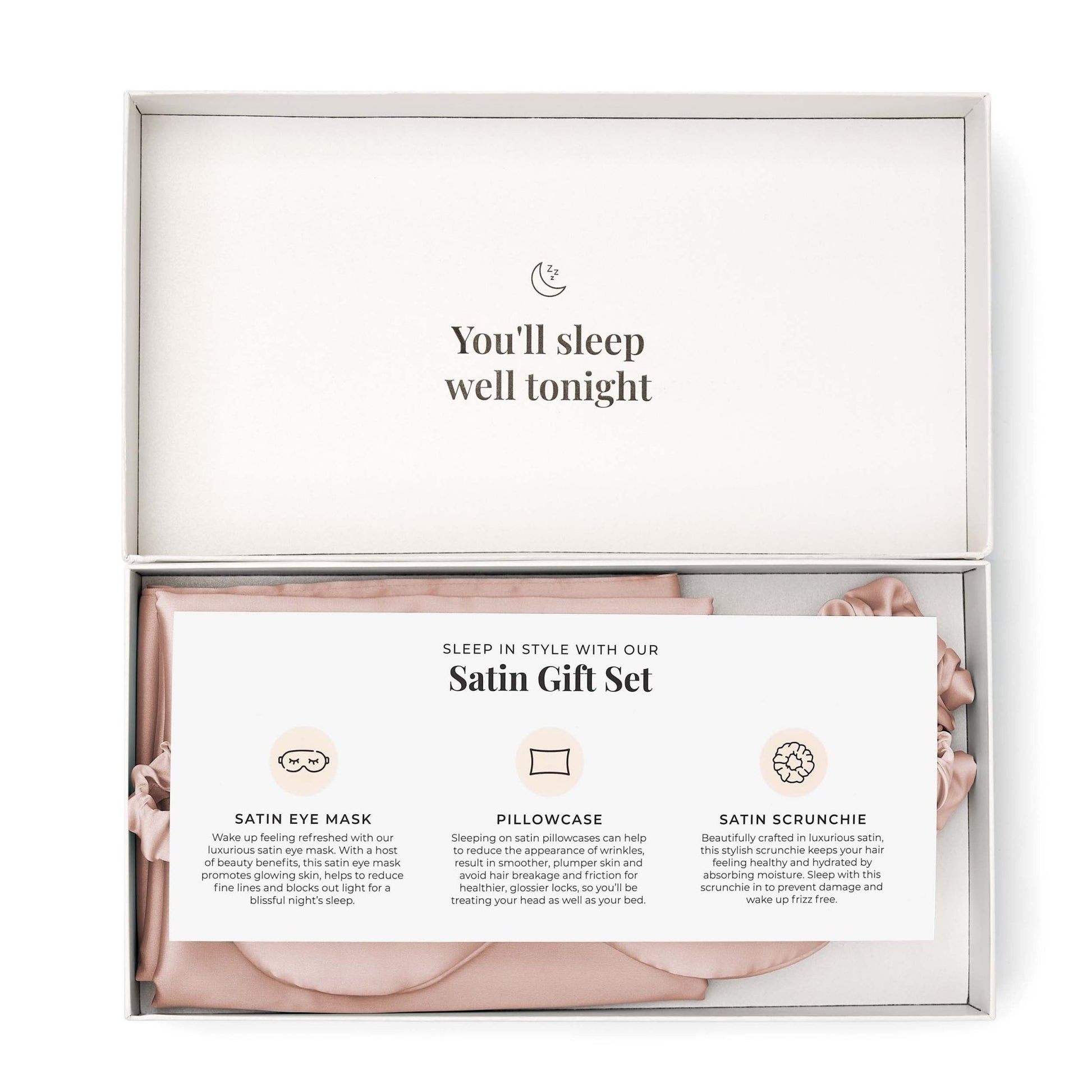 Drift into a peaceful sleep with our indulgent satin gift set, designed to care for your skin and hair while you sleep. Featuring a silky-soft pillowcase, a matching eyemask for uninterrupted rest, and a gentle scrunchie to prevent breakage, this set is the ultimate nighttime luxury.