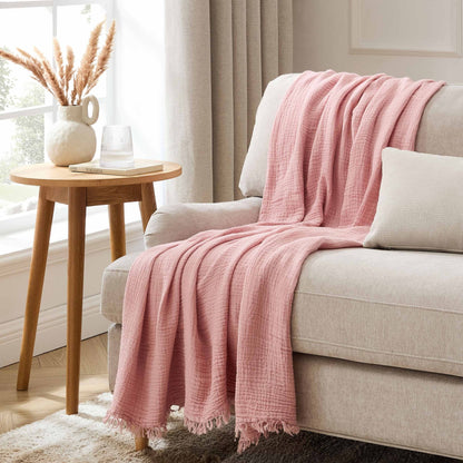 Made from 100% cotton muslin, this throw combines delicate texture with lightweight comfort. The tufted design adds a touch of understated elegance, while the four-layer construction keeps you cosy year-round. Drape it over your sofa or bed for a relaxed, inviting look.