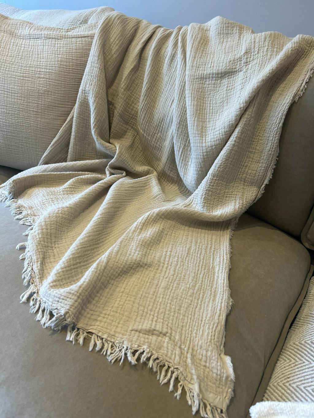 Made from 100% cotton muslin, this throw combines delicate texture with lightweight comfort. The tufted design adds a touch of understated elegance, while the four-layer construction keeps you cosy year-round. Drape it over your sofa or bed for a relaxed, inviting look.