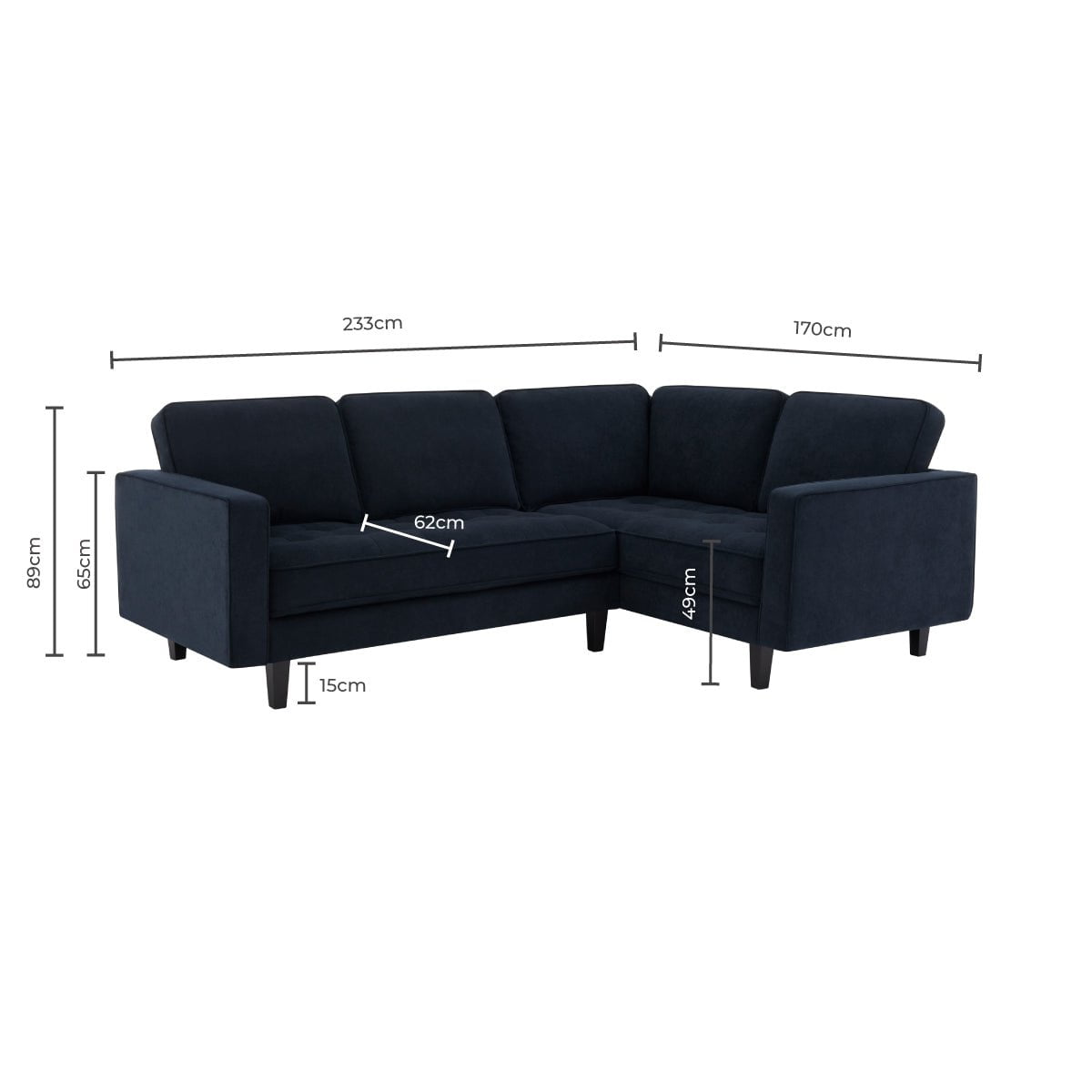 Made with a soft-to-the-touch matte velvet fabric in deep midnight, this corner sofa has smooth, sleek lines and is beautifully designed. With a buttoned quilted seam design on the seat cushions and subtle piping detail, it also has black legs for a contemporary finish. The sofa is designed with back cushions that give a firm down-like feel for unmatched comfort.
