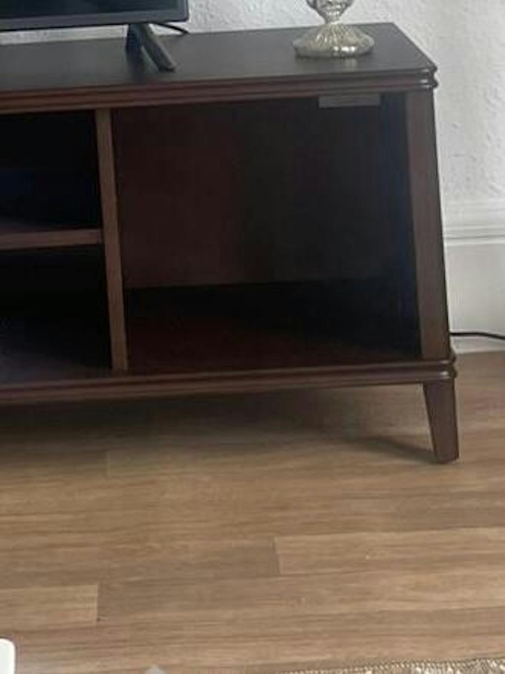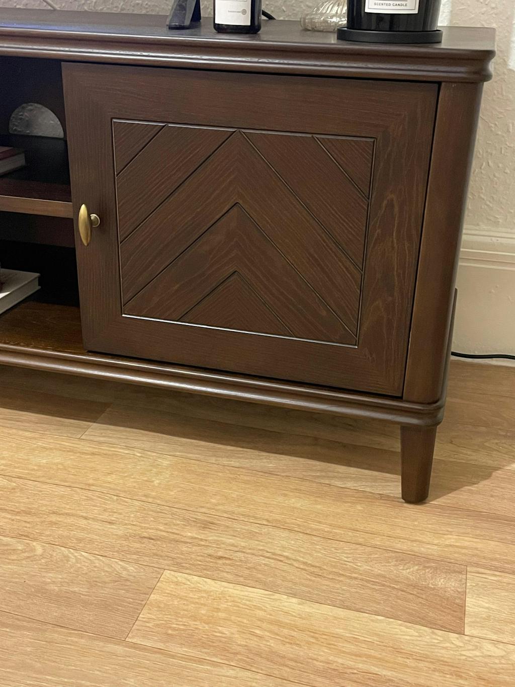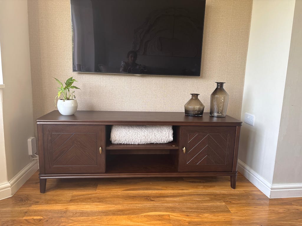 Crafted from solid wood and premium veneer, this TV unit is available in warm wood or rich walnut finishes. Its eye-catching chevron design adds a modern twist, while two spacious cupboards and an open shelf provide the perfect spot for game consoles or DVDs, keeping your living room sleek and organised.