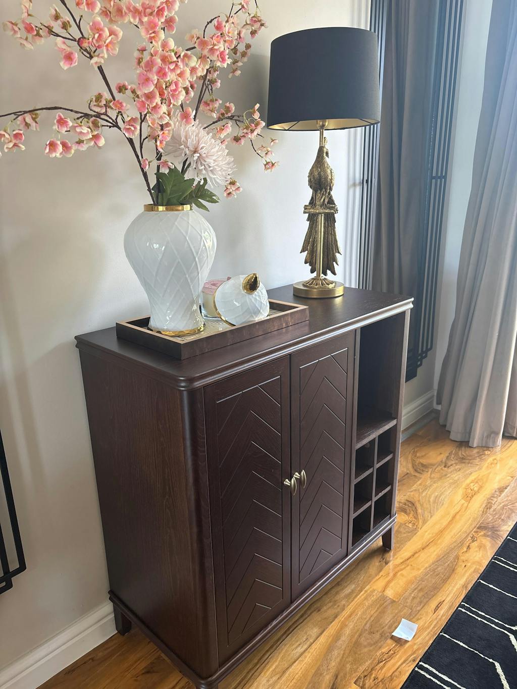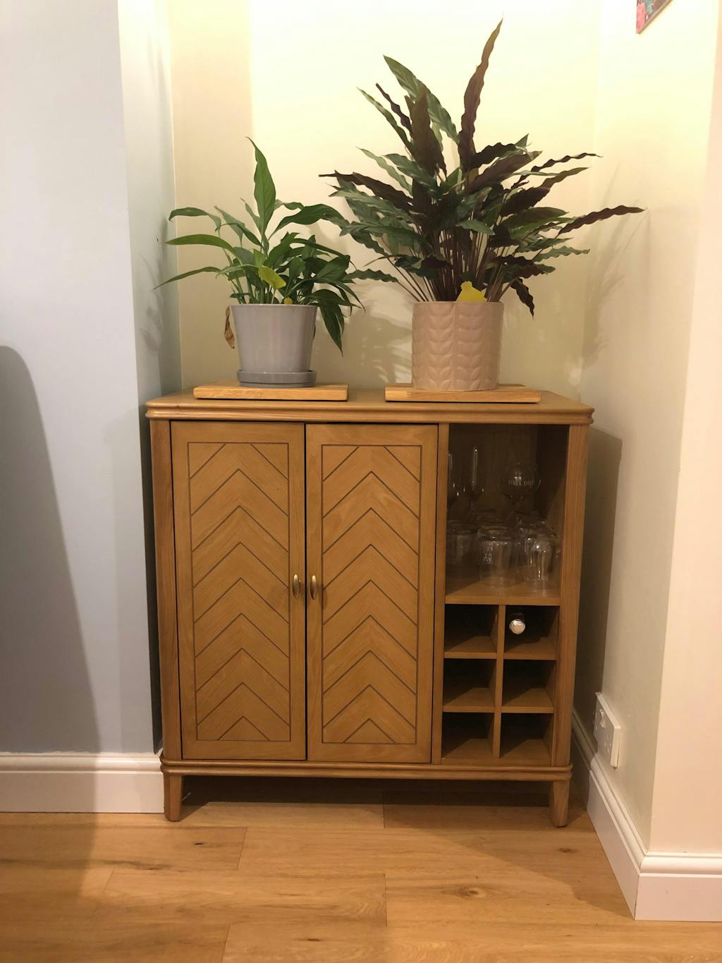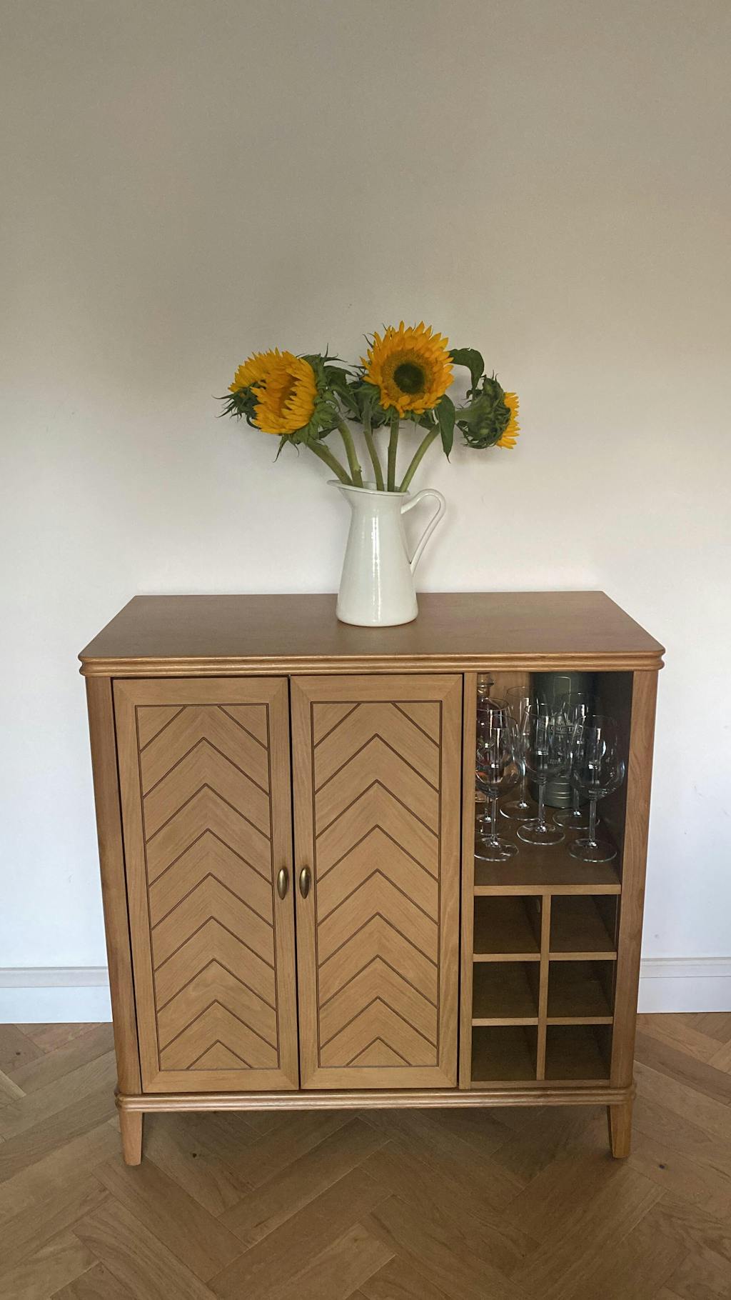 Crafted from solid wood and premium veneer, this TV unit is available in warm wood or rich walnut finishes. Its eye-catching chevron design adds a modern twist, while two spacious cupboards and an open shelf provide the perfect spot for game consoles or DVDs, keeping your living room sleek and organised.