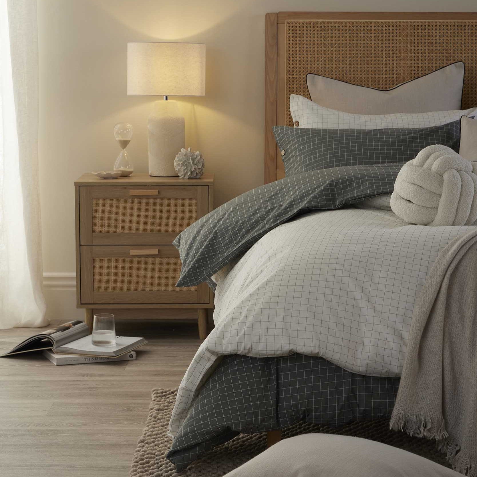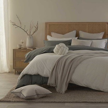 Crafted from 100% cotton percale with a 200 thread count, Thea blends effortless style with breathable comfort. The small-scale check print offers a modern twist on a timeless pattern, while wooden button details add a natural, rustic feel.