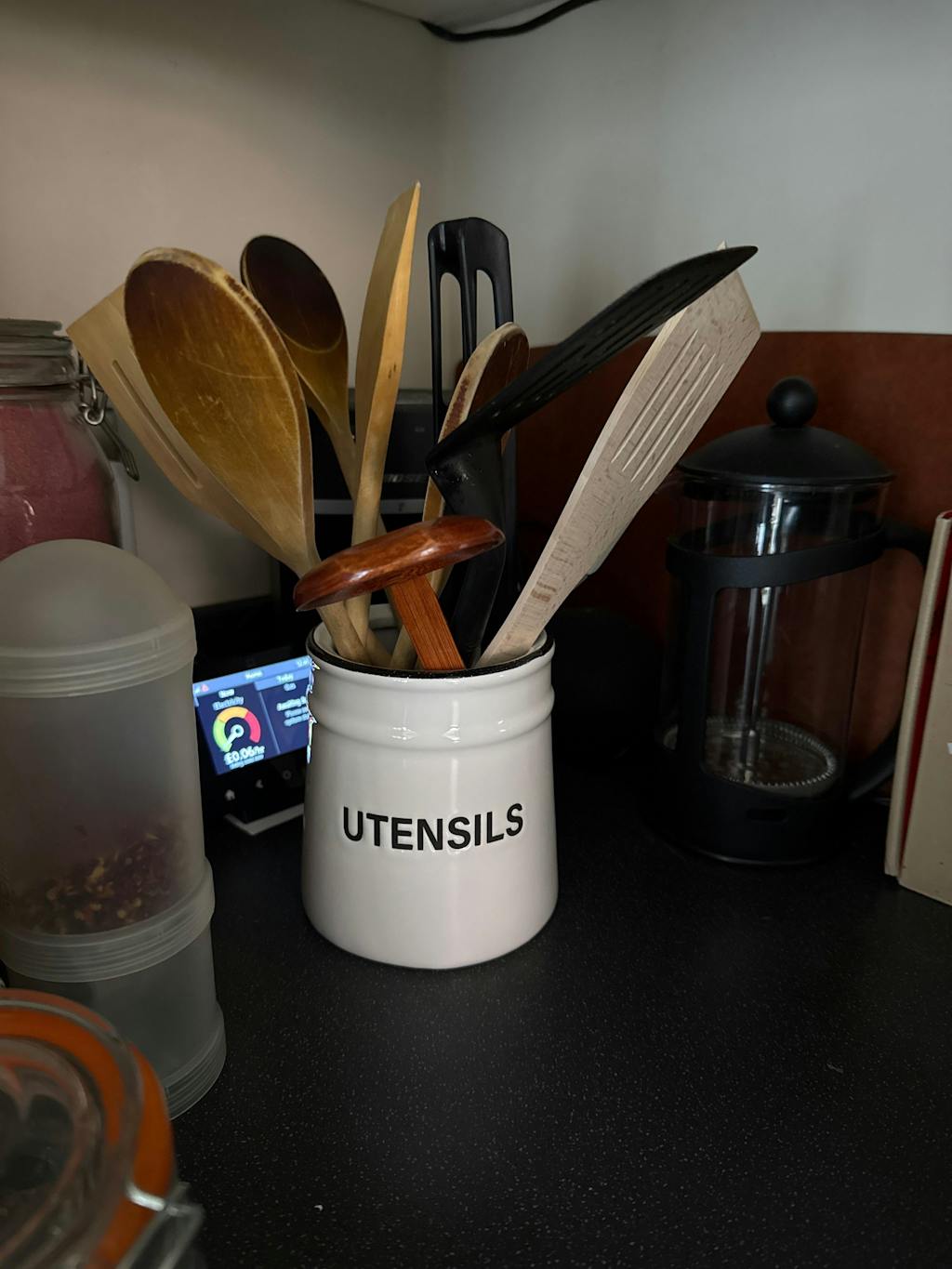 Declutter your countertops with this sleek white utensil holder. Made from durable dolomite, its classic design with bold black lettering adds a touch of modern farmhouse charm to any kitchen. Perfect for keeping your spatulas, spoons, and whisks neatly organised and always at hand.