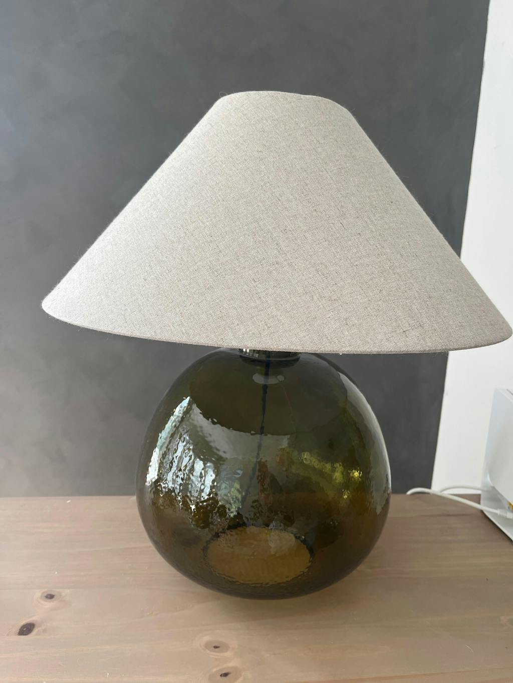This unique lamp features a stunning glass base in a rich, earthy green hue. Paired with a classic natural conical shade, this lamp offers a warm and inviting glow, perfect for relaxing. The timeless design and versatile colour make it a perfect addition to any living room, bedroom, or home office.