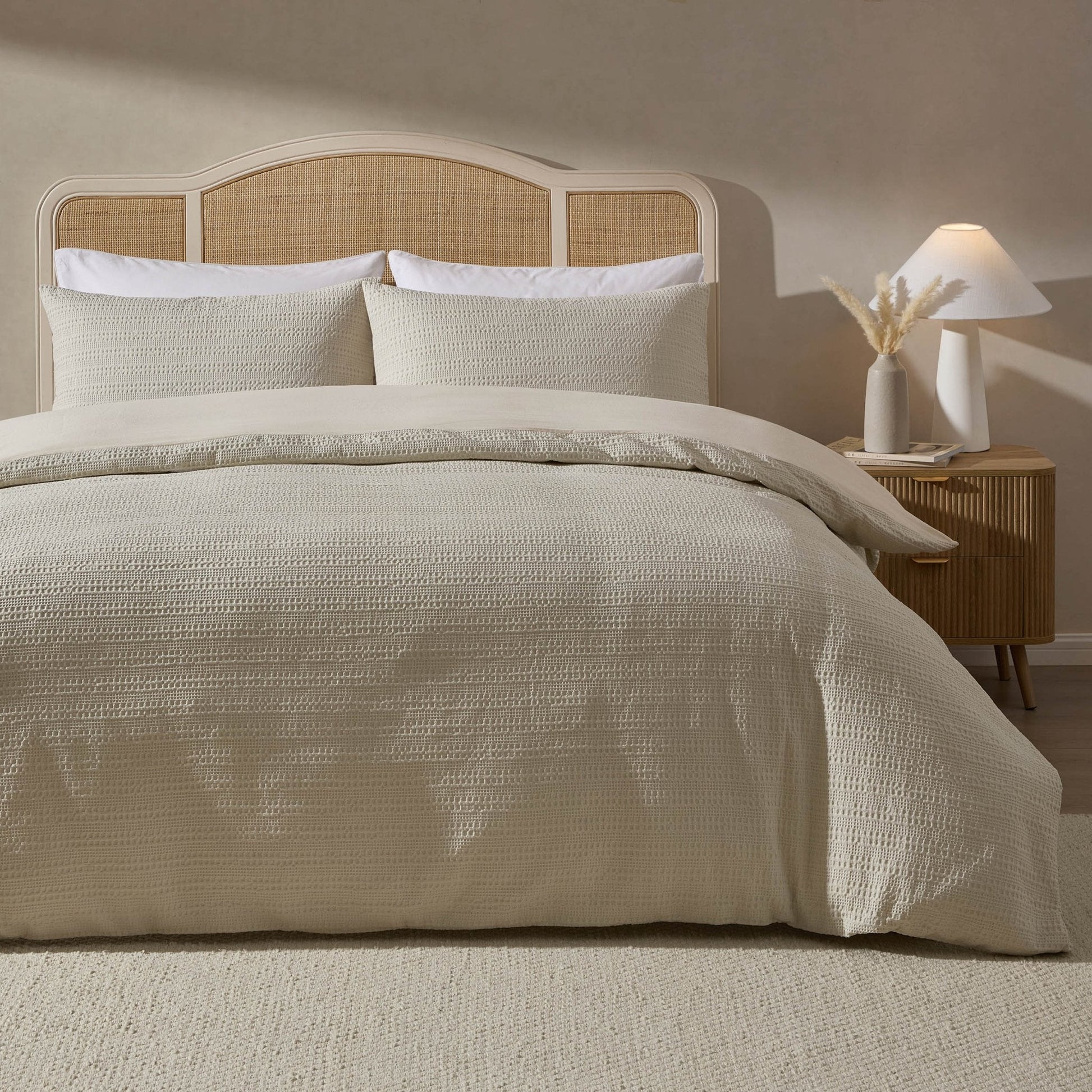 Made from a comfortable 100% cotton material, the waffle fabric features a 200 thread count reverse side. Stylish and soft, this Ecru duvet cover set is a focal point in the bedroom. Choose between double, king, and super king sizes, each including 2 matching pillowcases.