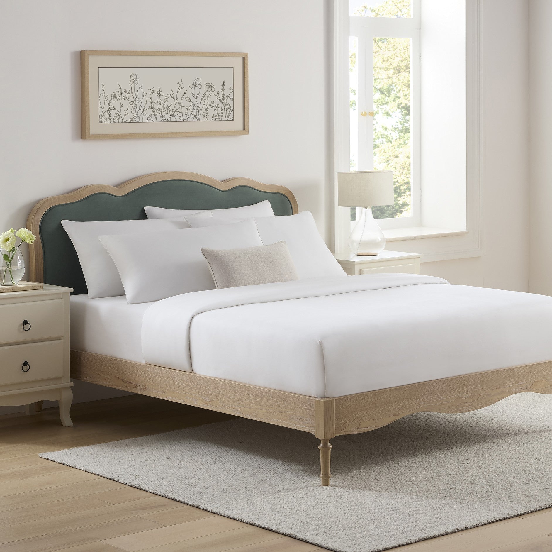 Featuring a solid natural wood-effect frame with subtle scalloped detailing, this bed frame combines lasting durability with timeless elegance. With a slatted wooden base for unrivalled comfort and support as you sleep, the headboard is upholstered in a stunning green velvet fabric, adding a touch of luxury and a pop of colour to your sleeping space. Regency-style legs provide the perfect finishing touch.