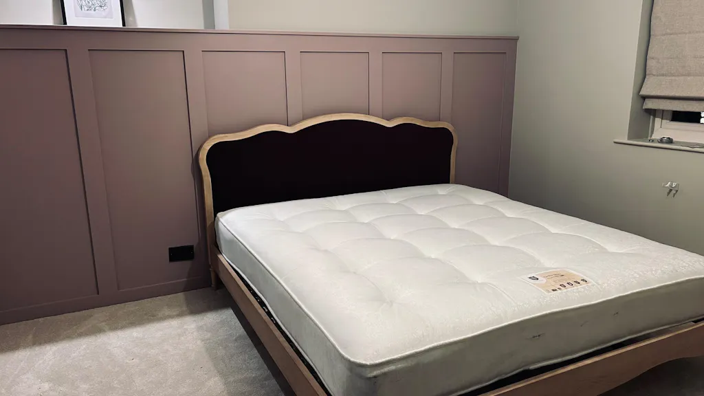 Featuring a solid natural wood-effect frame with subtle scalloped detailing, this bed frame combines lasting durability with timeless elegance. With a slatted wooden base for unrivalled comfort and support as you sleep, the headboard is upholstered in a stunning velvet stone fabric, adding a touch of luxury and a pop of colour to your sleeping space. Regency-style legs provide the perfect finishing touch.